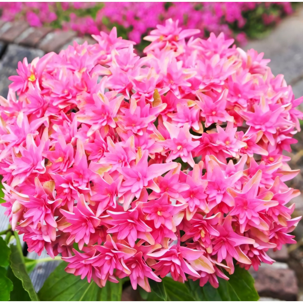Гортензия крупнолистная Princess Diana (Принцесса Диана) - это изысканный кустарник как для сада так и для патио. Она радует Вас большими шапками розовых цветов неоднократно в течение лета и в начале осени. Листва прекрасно дополняет потрясающие цветы, обеспечивая привлекательный весенний и осенний цвет, что только добавляет привлекательности этого необычного сорта гортензии. Соцветия- крупные округлые шары с двойными или тройными звездообразными цветами, открывающимися осенью. Размер соцветий 30-35 см. Цвет цветов может варьироваться в зависимости от типа почвы. Кустарник раскидистый 1 м.