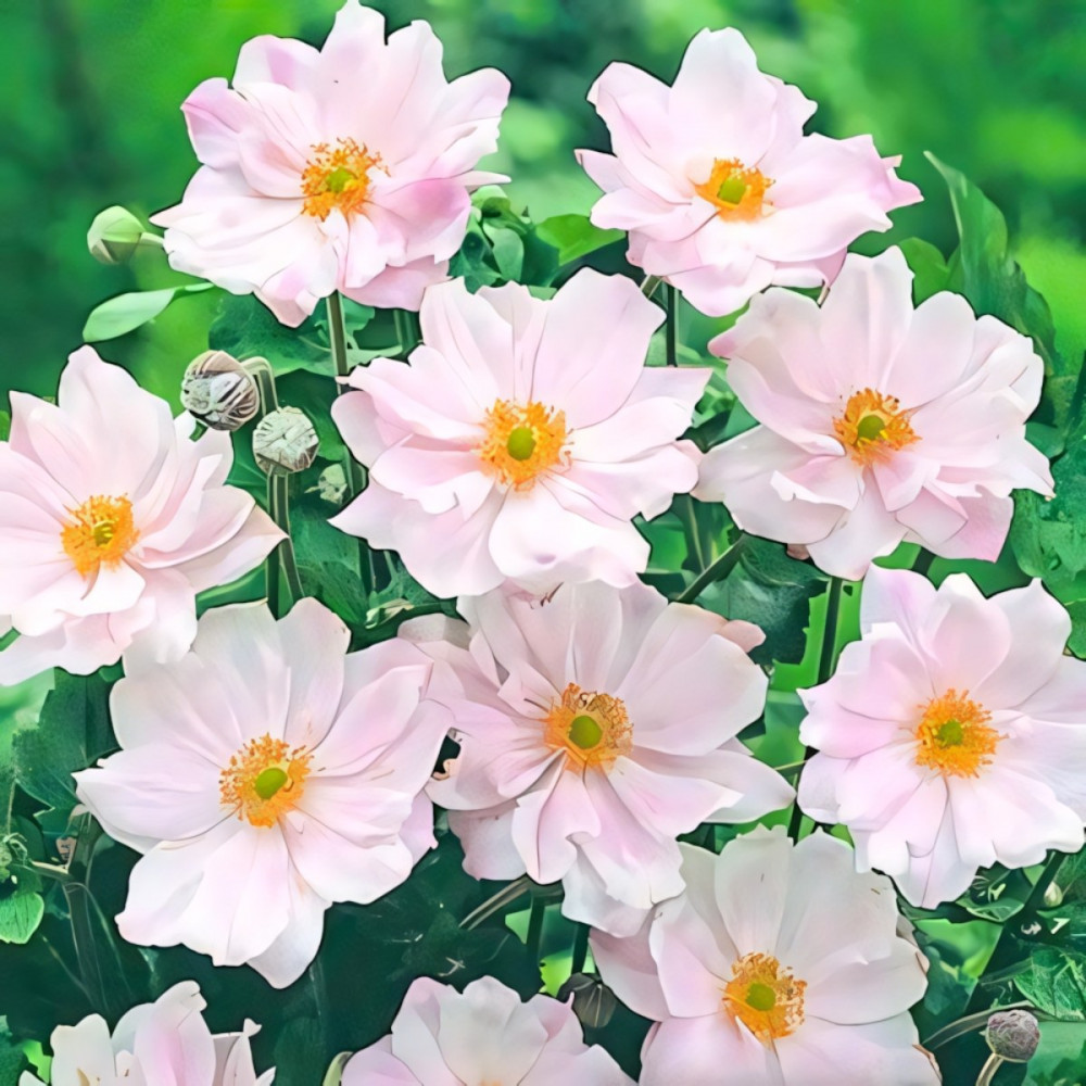 Анемона Королева Шарлотта – обильноцветущий многолетник с красивыми нежно-розовыми цветками. На каждом цветоносе формируется по целому букетику из 12-15 крупных бутонов (диаметр около 7-8 см). Растение высокое (80-100 см), стебли изящно ветвятся. Цветок неплохо переносит небольшую засуху, а вот на зиму требует укрытия листвой. Сажают анемону ранней весной, отдавая предпочтение полутеневым участкам. Каждые 6 лет кустик следует пересаживать на новое место. Великолепно смотрится в посадках с другими многолетниками, отлично подходит для букетов.