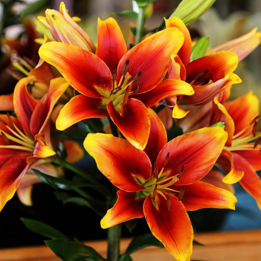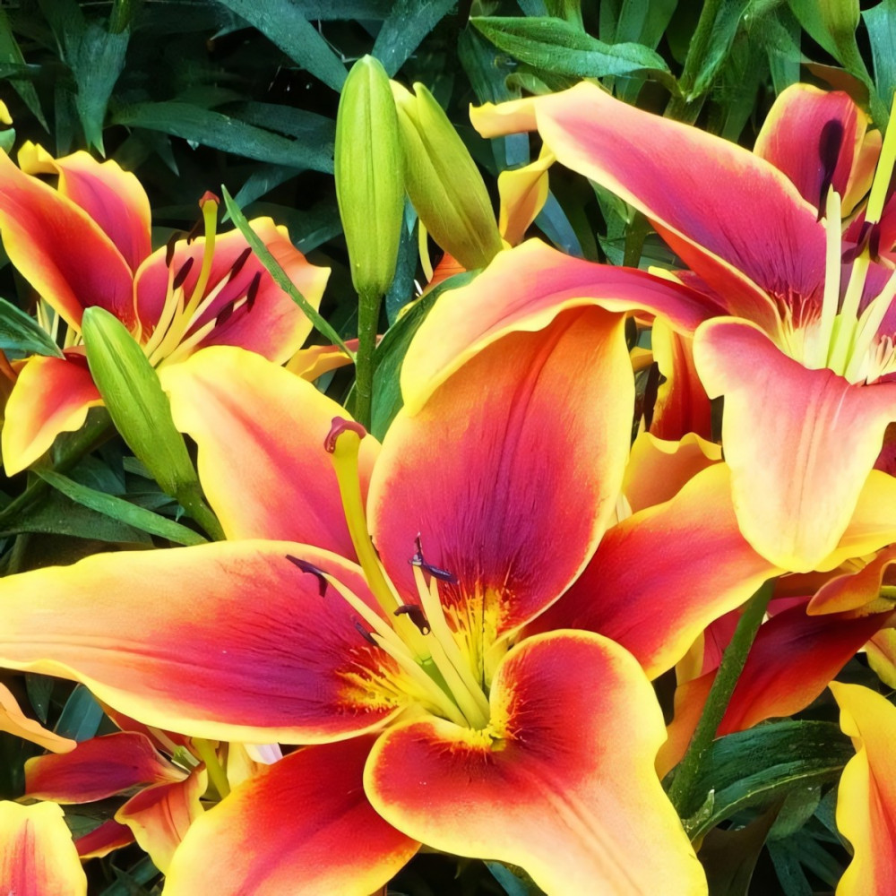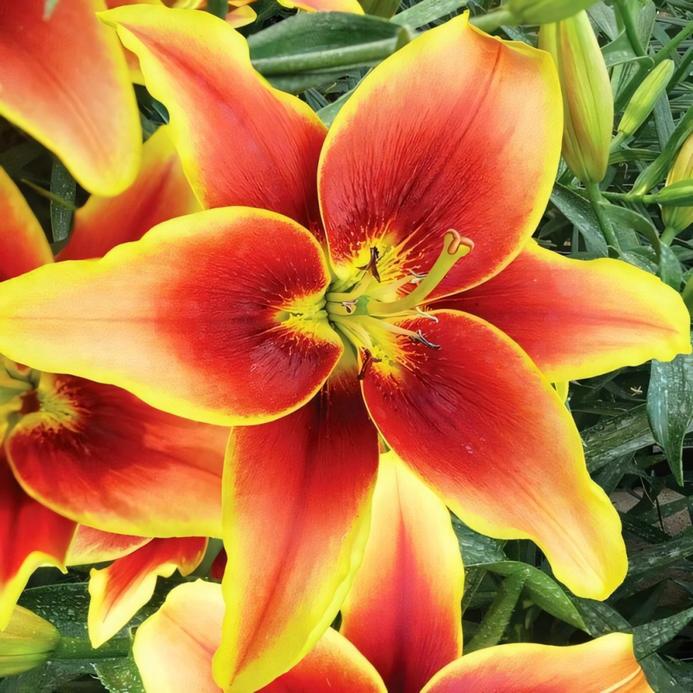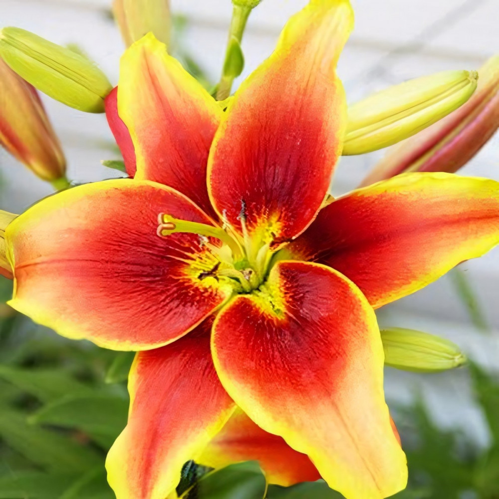 | Период цветенияиюль-август | Стандарт поставкиЛуковица в торфе | Цвет цветкабронзово-алый с желтой каймой |