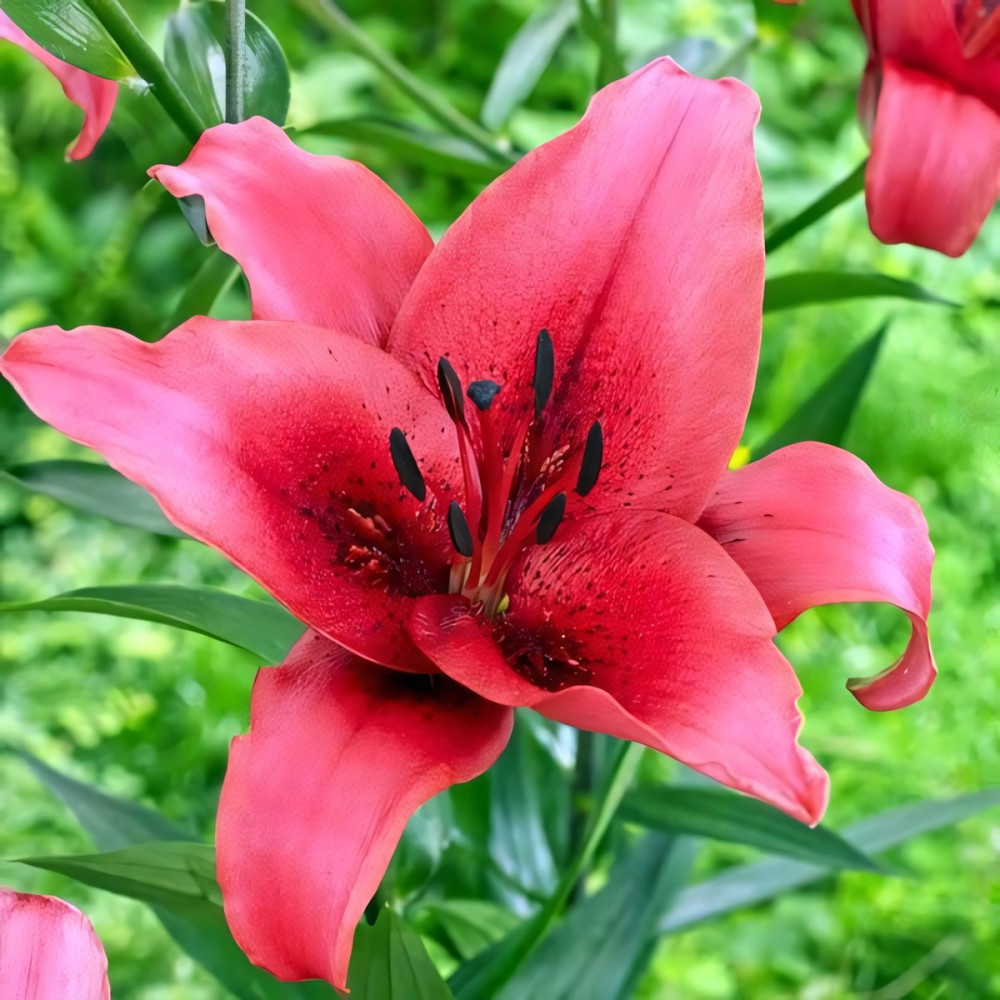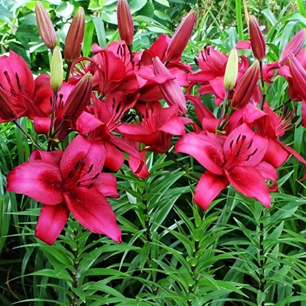 Метровая красотка, луковицы которой способны выдерживать отечественные зимы без дополнительного укрытия. Ранней весной они дают сильные побеги, быстро превращающиеся в метровые цветоносы с перистой тонкой листвой темно-зеленого окраса. Среди обилия можно заметить робкие цветоносы, несущие на себе лилово-зеленые бутоны с плотно сжатыми лепестками. Проснувшись однажды утром, вы с удивлением обнаружите на их месте крупные малиново-сиреневые цветы, каждый лепесток которых украшен россыпью темных крапинок.