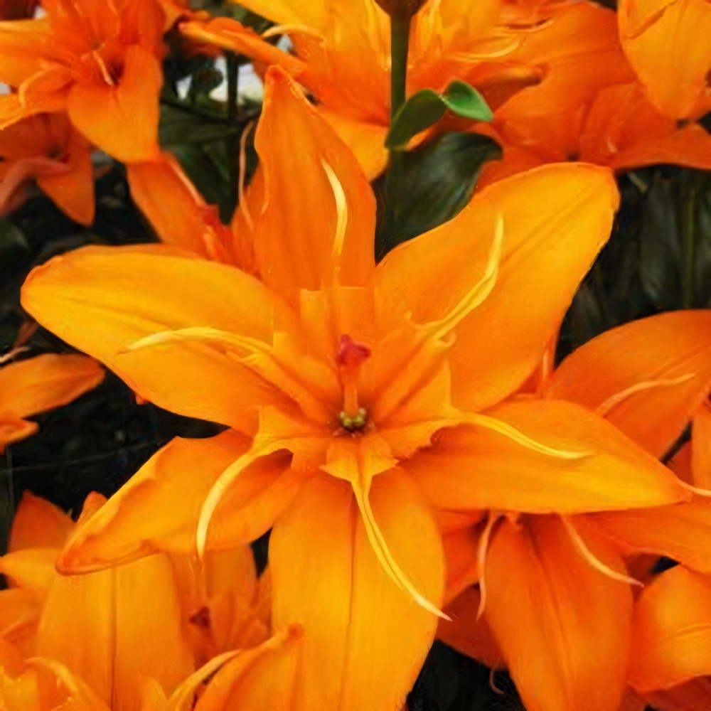 Уникальная НОВИНКА! Махровый, плотный, ярко-оранжевый цвет. Внутренние лепестки оригинальной формы с длинными тонкими кончиками. Высота 100 см, диаметр цветка до 17 см, размер луковицы 12/14.