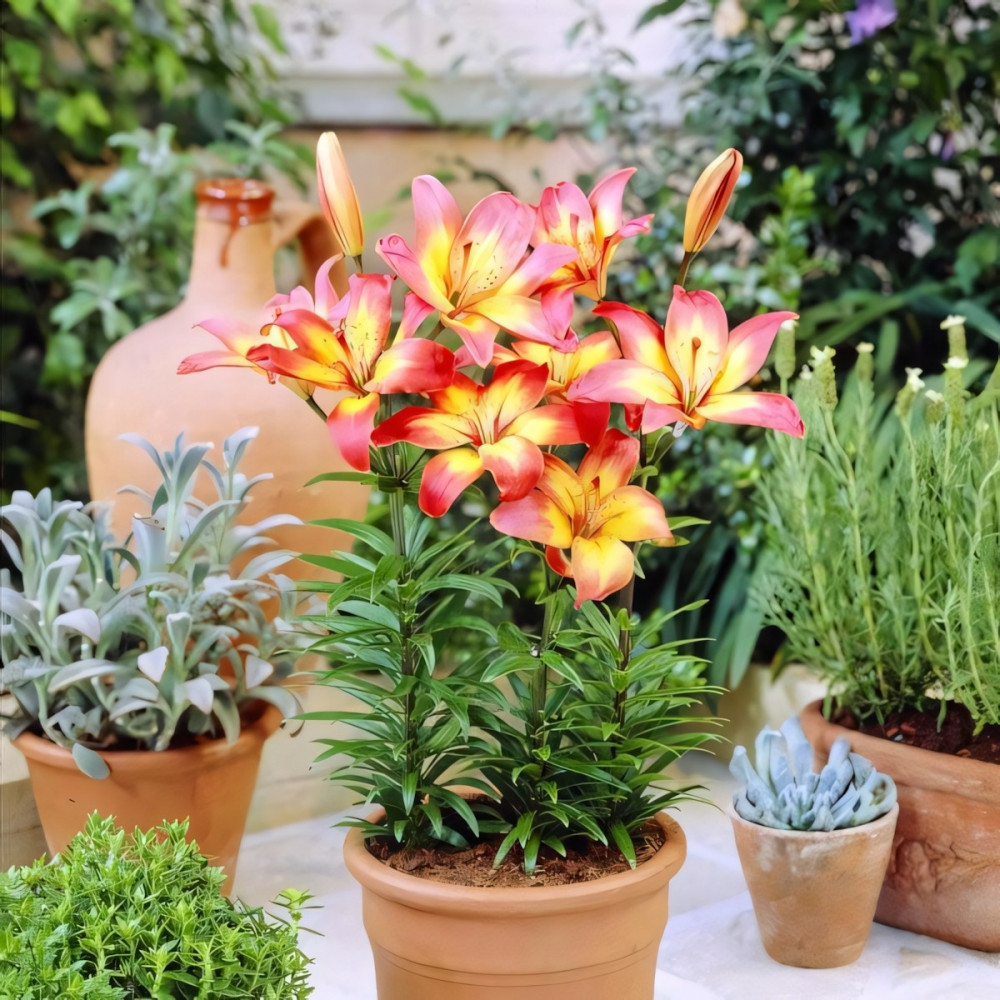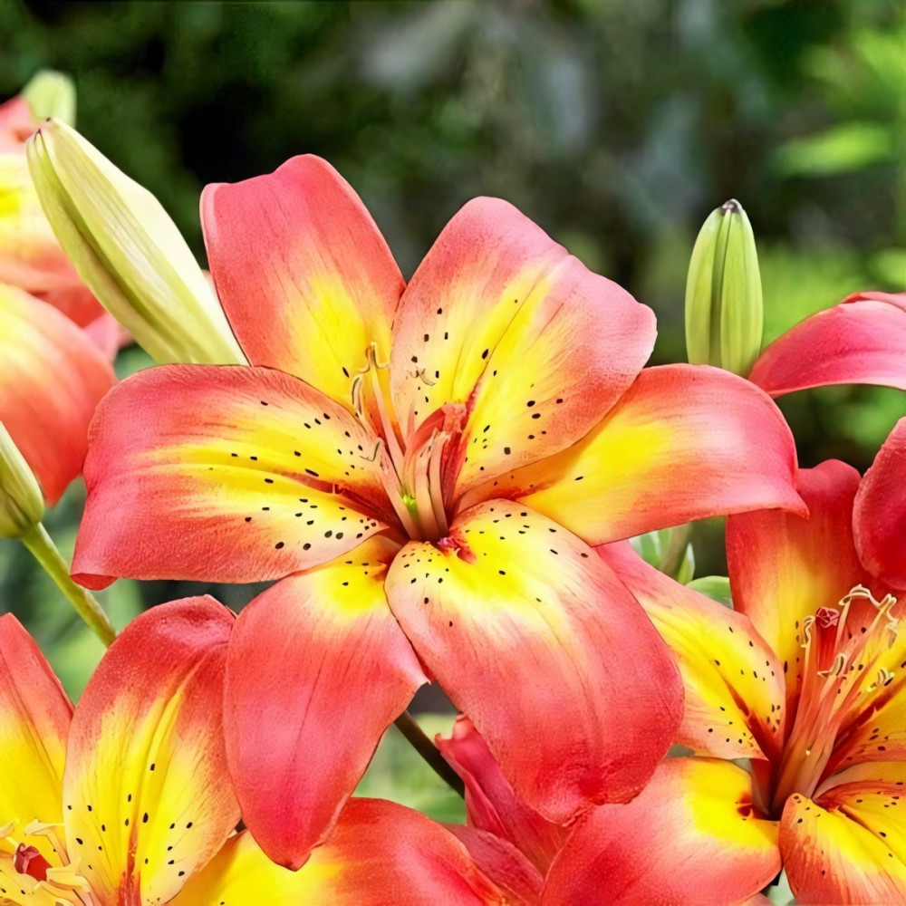 Лилия азиатская Costa del Sol (Коста Дель Сол)-луковицы этой лилии привлекают внимание буйством красок. Растение низкорослое. Прочные темно-зеленые стебли вырастают до 0,6 м в высоту. Окраска двухцветная – от центра к середине лепестка желтая, а кончики красно-розовые. У горла редкий, мелкий темный крап. Размер цветка около 13 см. Распускается в июне и июле. Лилии хорошо развиваются на солнечных, защищенных от сквозняков местах и в полутени. Предпочитают рыхлые, дренированные почвы. Не любят переувлажнения, плотных грунтов. Сорт используется на срезку, для украшения клумб. Хорошо смотрится в кашпо. Высота 60 см, диаметр цветка до 13 см, размер луковицы 12/14.