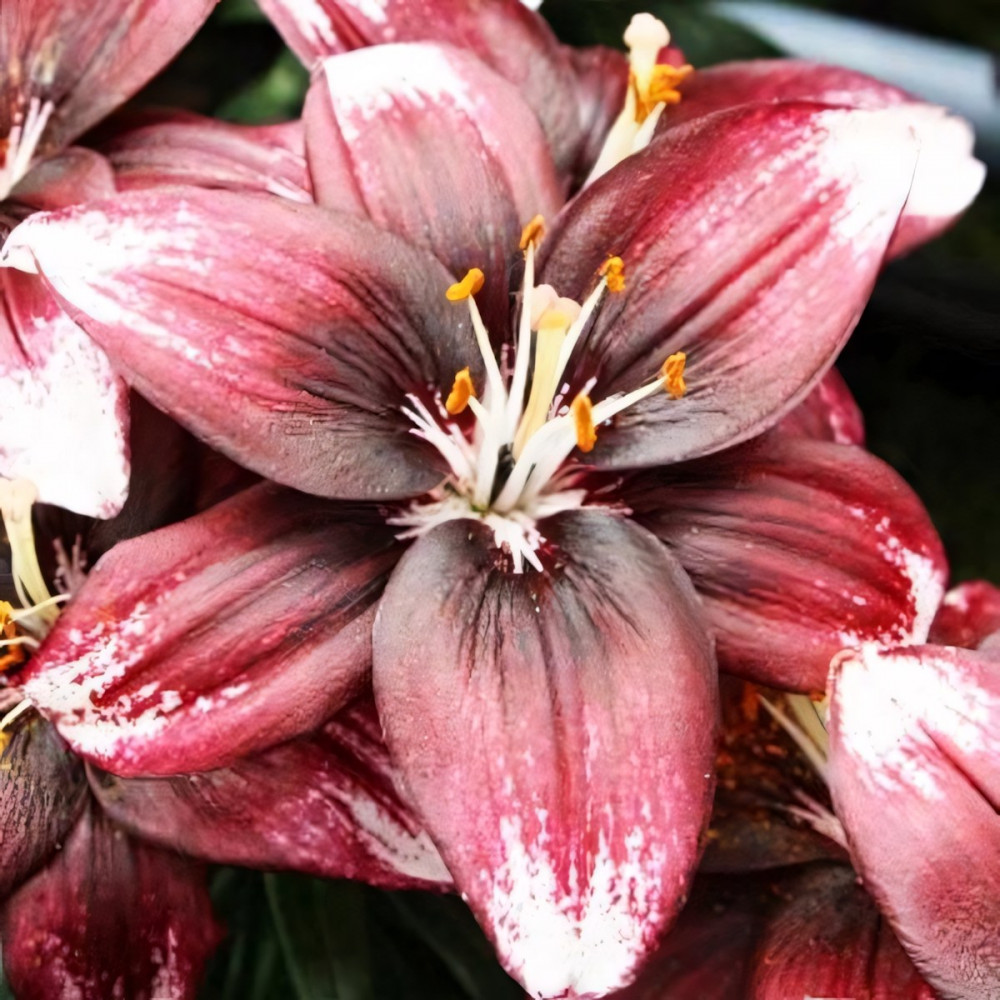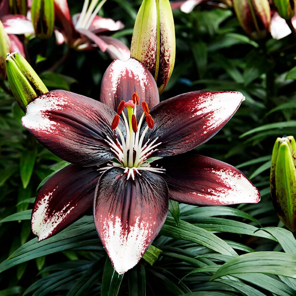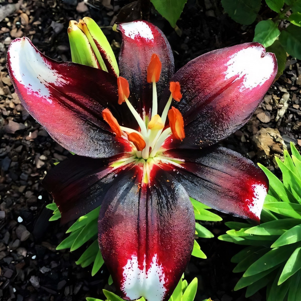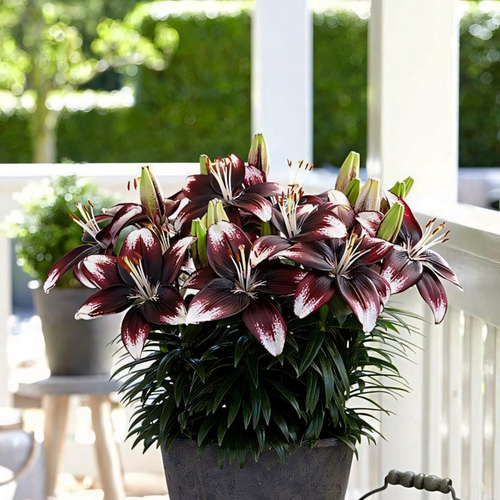 Очень эффектный сорт, несмотря на свои скромные габариты. Низкая лилия удивляет размерами бутонов. Цветок имеет необычный окрас, он бордовый, но ближе к сердцевине становится практически черным, кончики белые. Сорт выведен специально для контейнерного выращивания. Можно вырастить у себя на балконе, веранде, террасе.