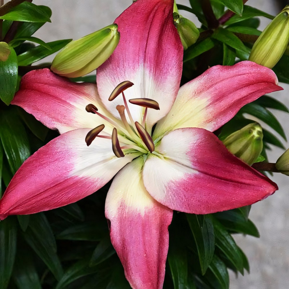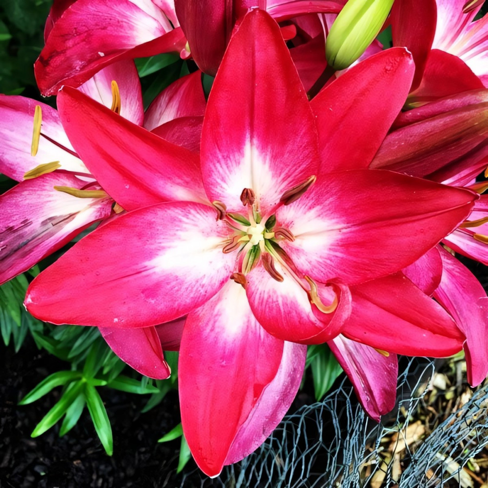 Компактный кустик украшают кораллово-розовые цветки до 15 см в диаметре. Глянцевая структура их лепестков в сочетании с жемчужно-белой серединкой создает эффект сияния. Несмотря на миниатюрность, эта лилия будет видна из любого уголка сада.