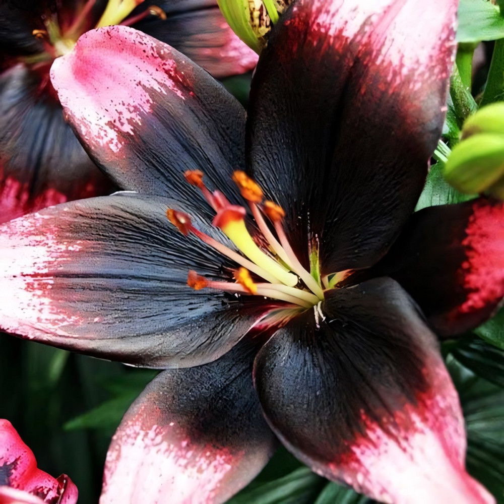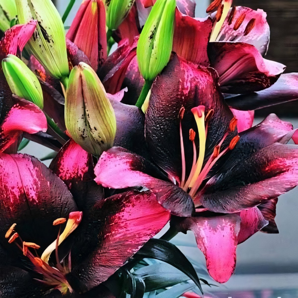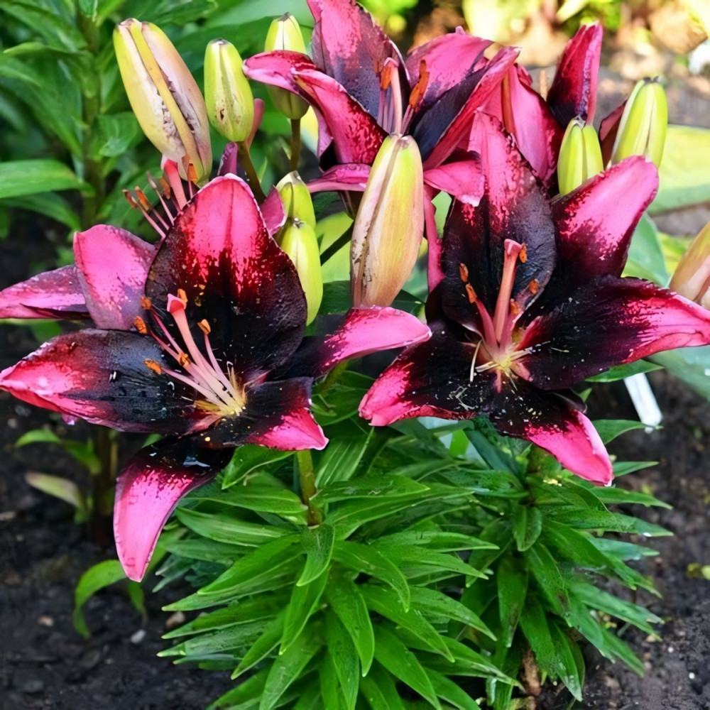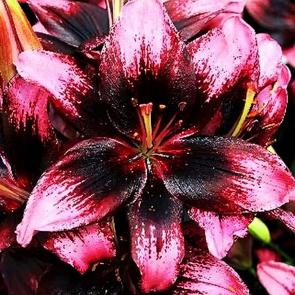 Еще один сорт в линейке низкорослых лилий серии Тайни. Это лилия-биколор: пурпурно-бордовые цветки, почти черные к середине с крапом, кочники светло-розовые. Цветок очень крупный. Tiny Poems (Тайни Поэмс) идеально подходит для оформления бордюров и альпинариев.