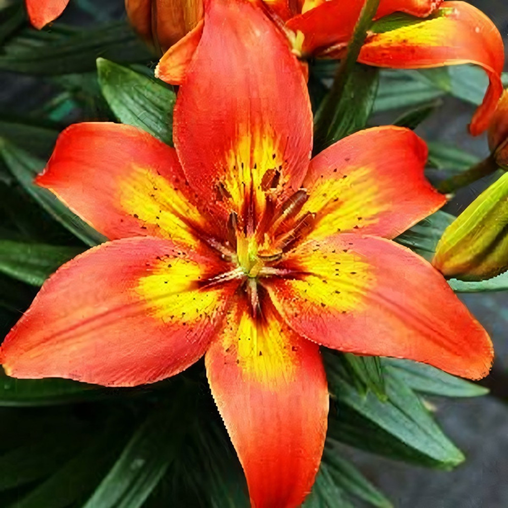 Красновато-оранжевый с жёлтыми небольшими мазками. Высота 40 см, диаметр цветка до 15 см, размер луковицы 11/12.