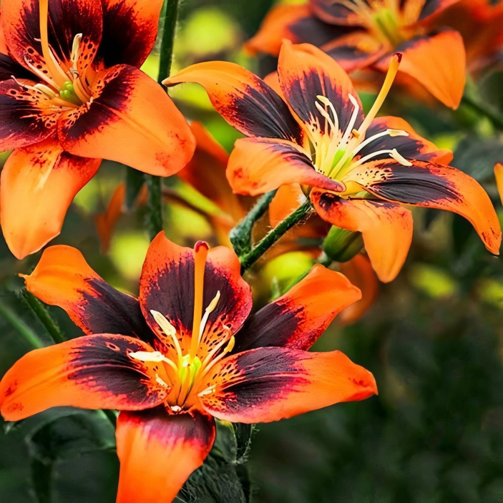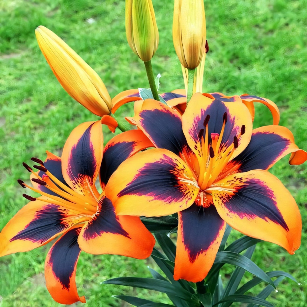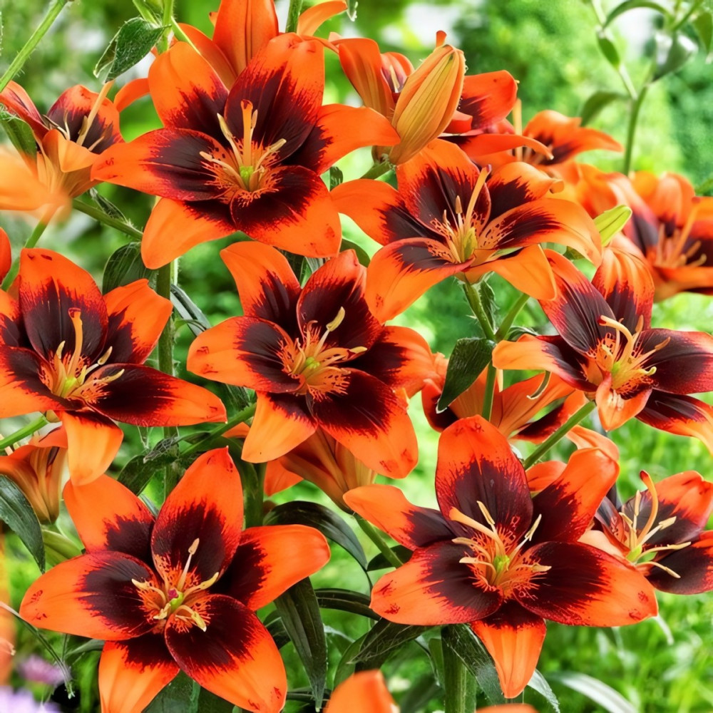 Лилия азиатская Easy Samba (Изи Самба)-эта лилия не производит пыльцу. При этом она все равно привлекает массу насекомых, желающих просто посидеть на ее шикарных лепестках. Их плотная и упругая структура готова к приему такого количества «гостей», тем более что их визит мимолетен. Отсутствие пыльцы компенсируется двумя вескими обстоятельствами – стойким ароматом и драматической внешностью соцветий. Они выкрашены в насыщенный мандариново-оранжевый оттенок, а каждый лепесток имеет посередине темно-фиолетовый «островок». «Тигровый» эффект придают выразительные крапинки в самом сердце цветка. Высота 110 см, диаметр цветка до 13 см, размер луковицы 10/12
