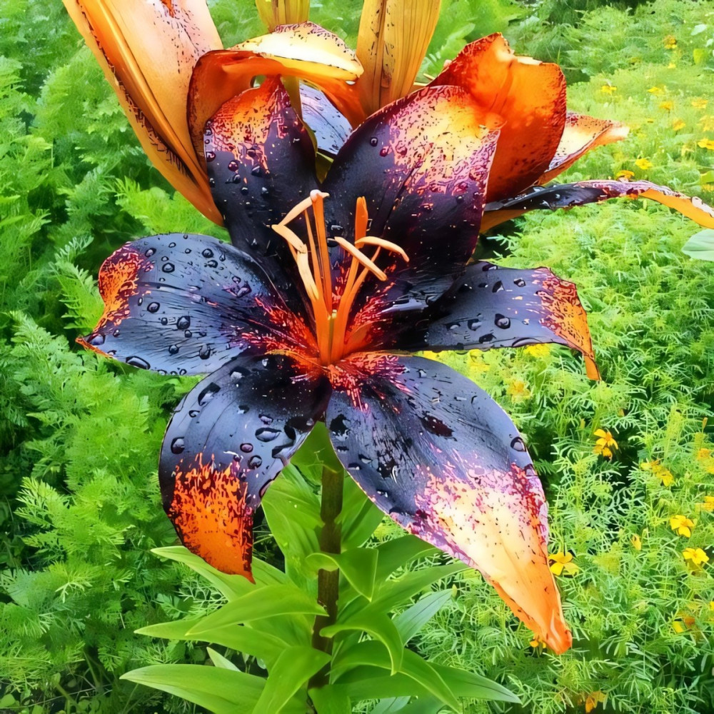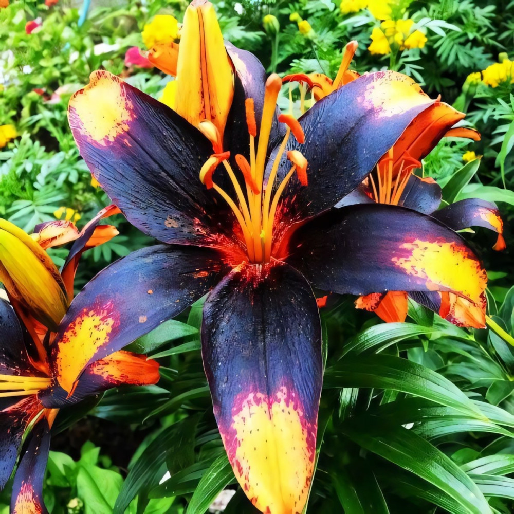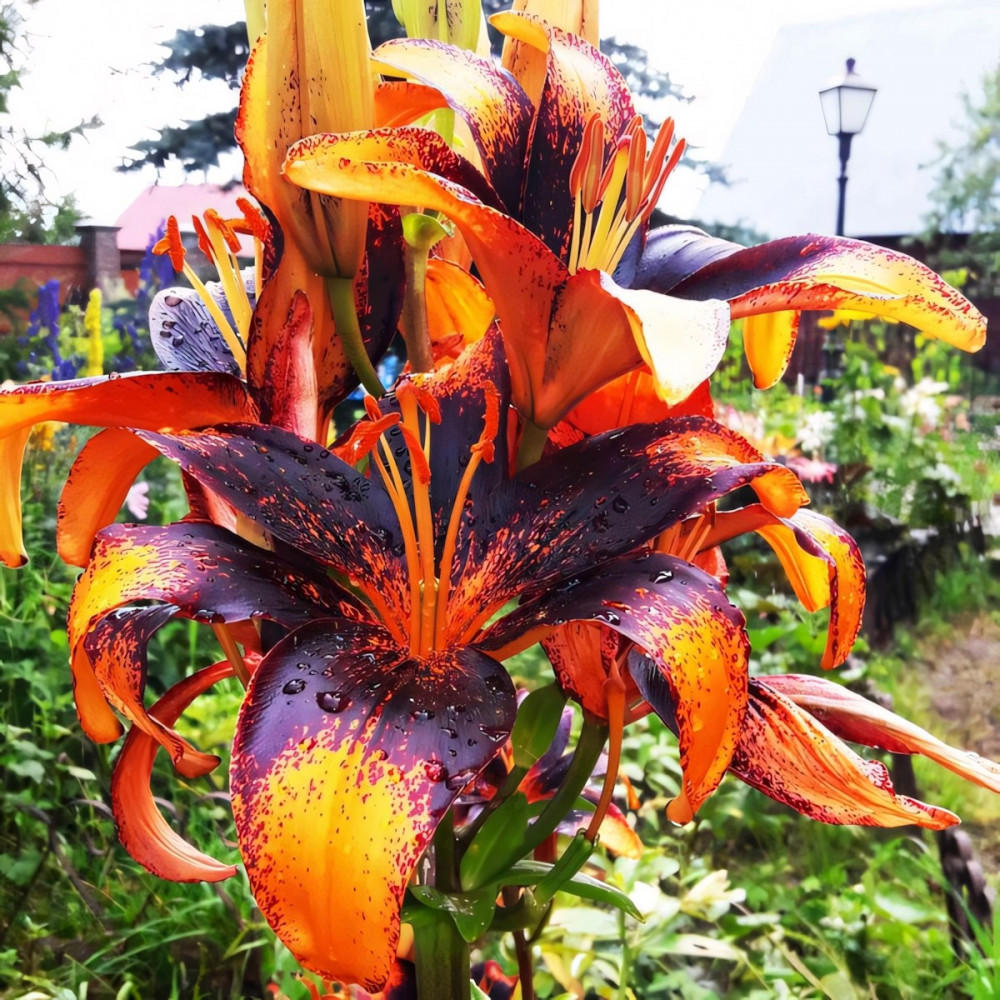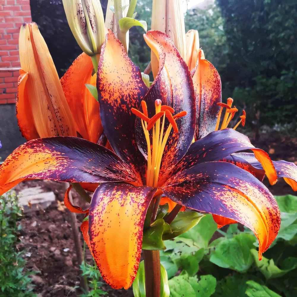 Эффектный сорт. Удивляет тигровой окраской раскрывающихся цветков. Темно-фиолетовый цвет в центре цветка контрастирует с ярко-оранжевыми кончиками лепестков. Оттенки плавно переходят из одного в другой, благодаря рассеянному темному крапу. На одном цветоносе вы не найдете ни одного одинакового цветка, природа будто раскрашивает каждый из них по отдельности.