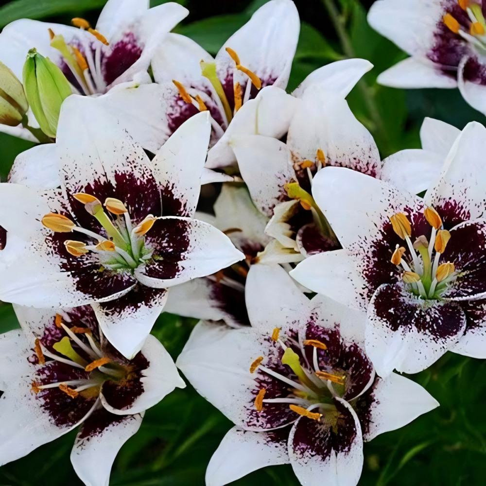 Лилия азиатская White Pixel (Вайт Пиксель) - Прекрасный азиатский сорт из серии Танго. Неприхотливое и морозоустойчивое растение. Лепестки сливочно-белые с пурпурным крапом в середине цветка, переходящим на внешние края. Высота 90 см, диаметр цветков до 15 см.