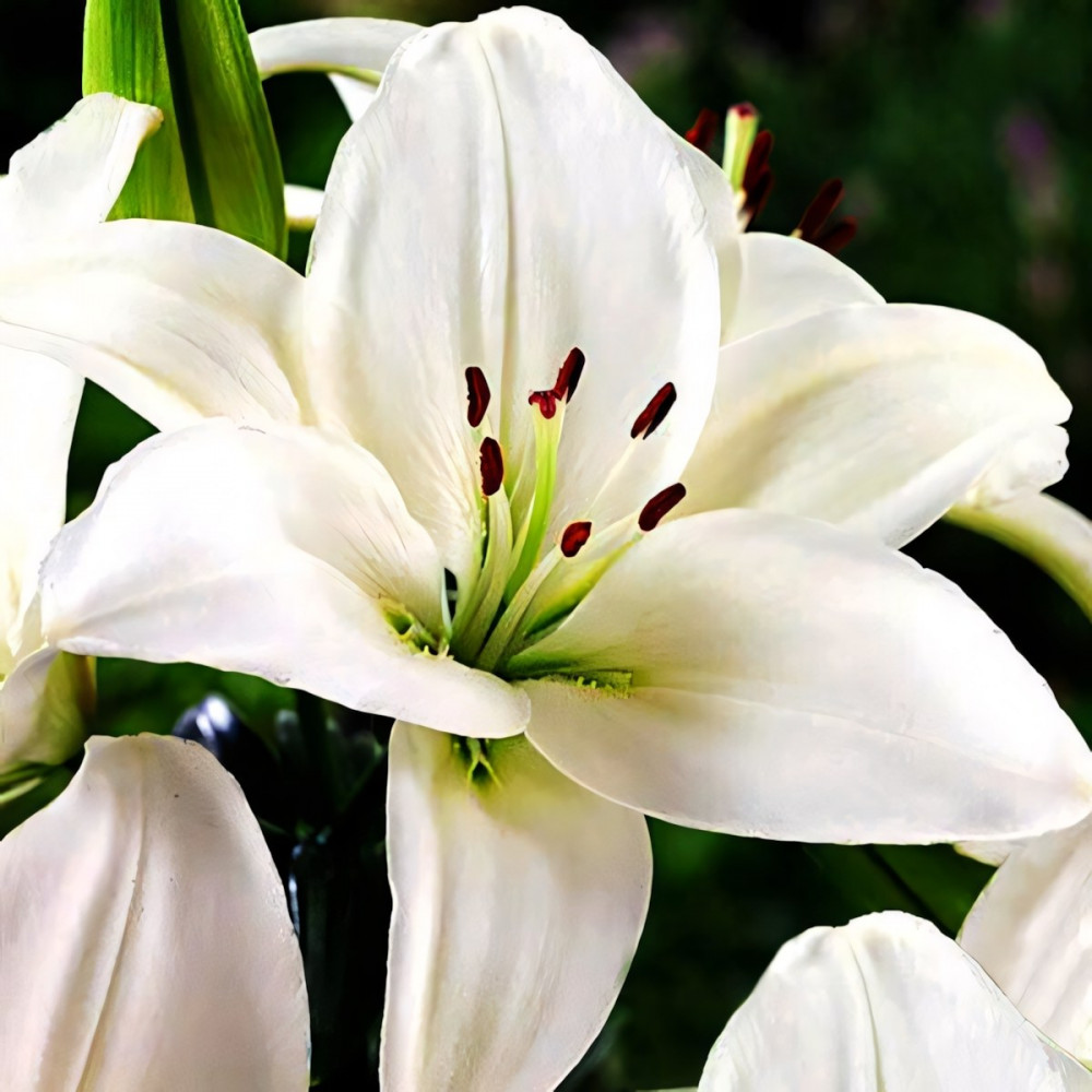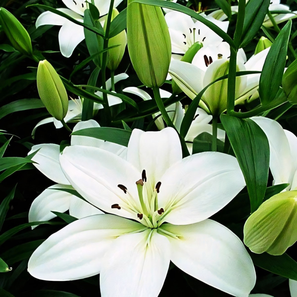 Белое очарование! Цветки крупные, растущие вверх и в бок. Горло светло-желтое. Лепестки слегка волнистые. Цветет обильно.