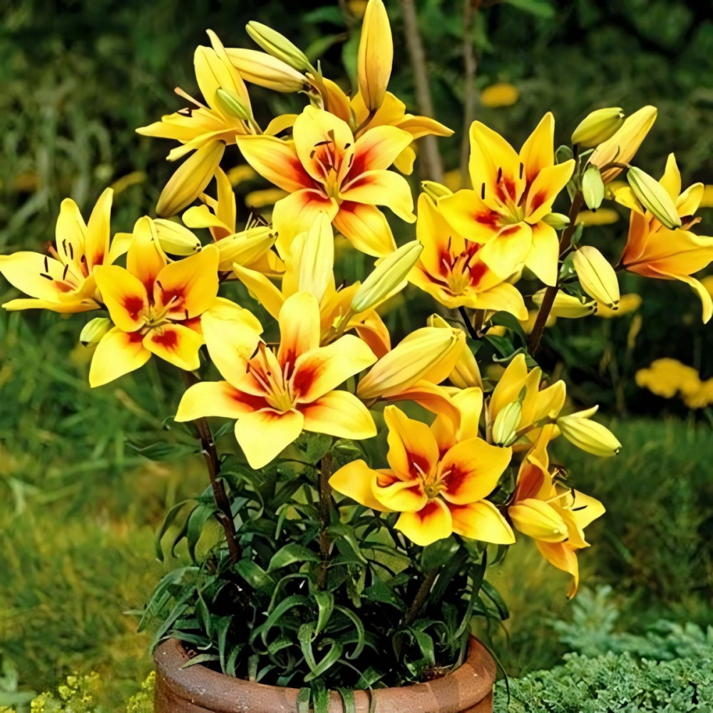 Оригинальная лилия с ее необычной окраской станет предметом восхищения гостей и соседей. Цветет этот сорт в середине июля. На стебле образуется до 7 цветков направленных вверх. Лепестки среднего размера, желтые, с красно-коричневым основанием и пыльниками, не отгибаются. Очаровательная лилия необычайно хороша в срезке. Высаживать Grand Cru (Гранд Крю) на клумбе лучше среди многолетников с желтыми или синими цветками.