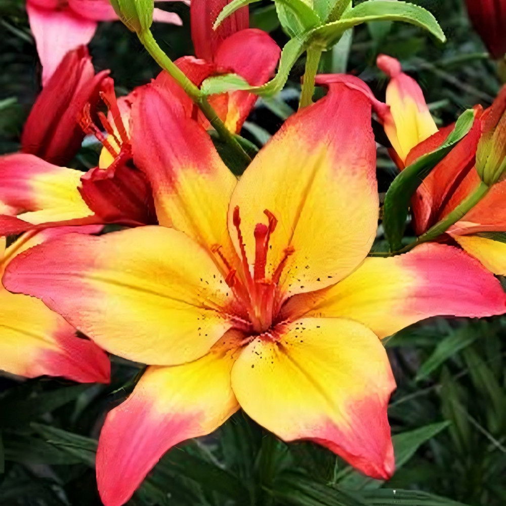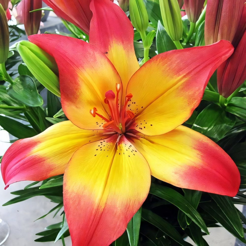 Цветок крупный, двухцветный - желтый с красным. Лепестки слегка волнистые. Очень эффектная лилия.