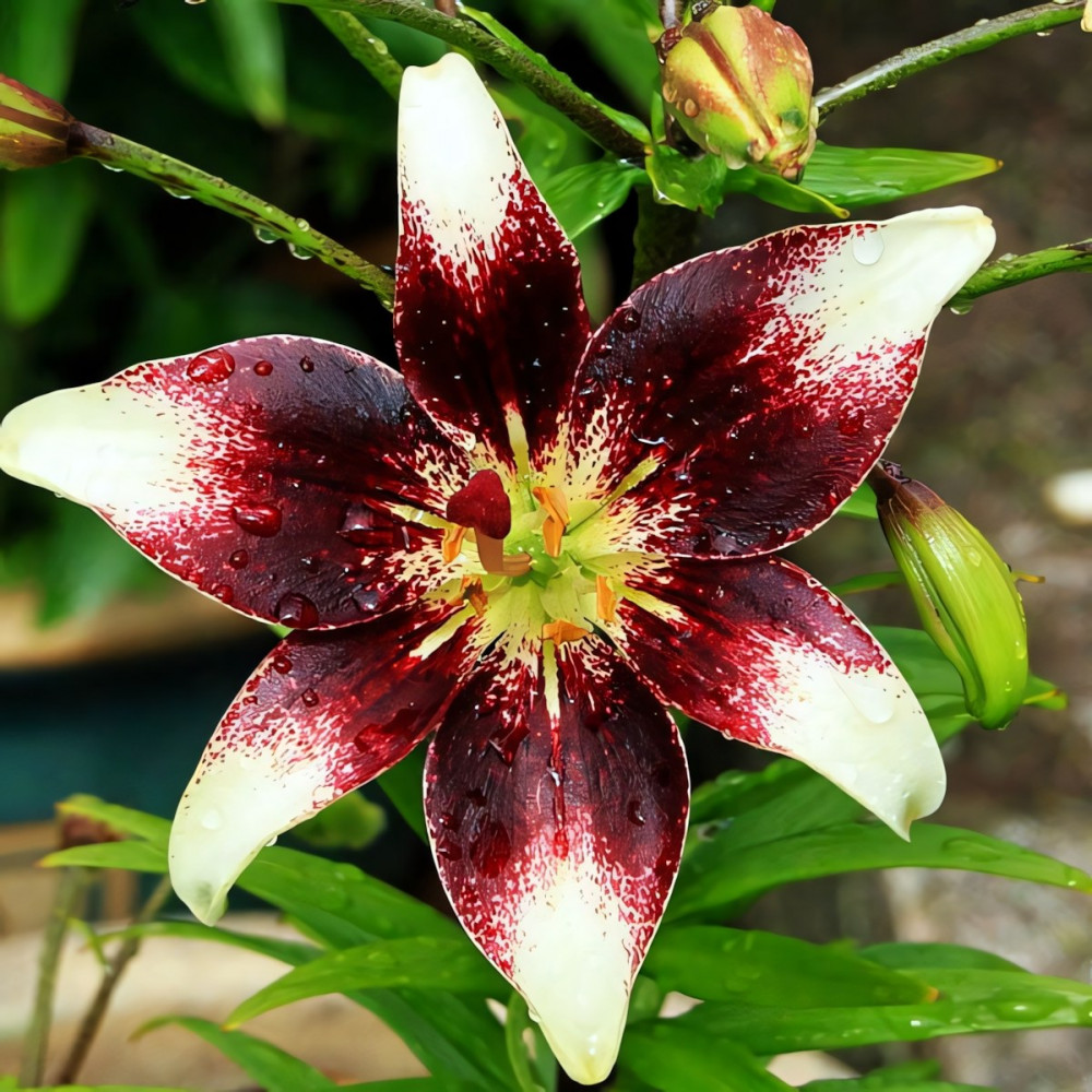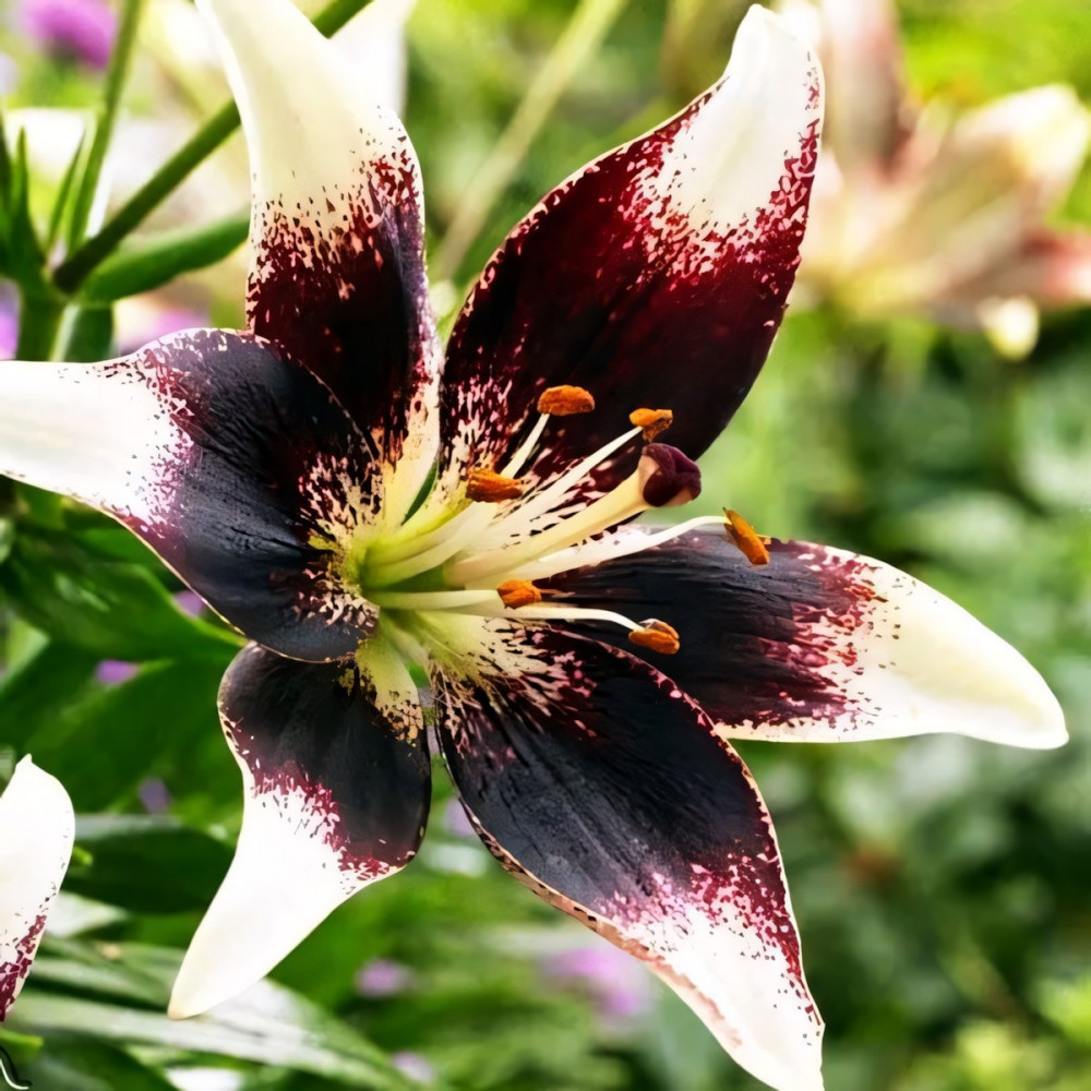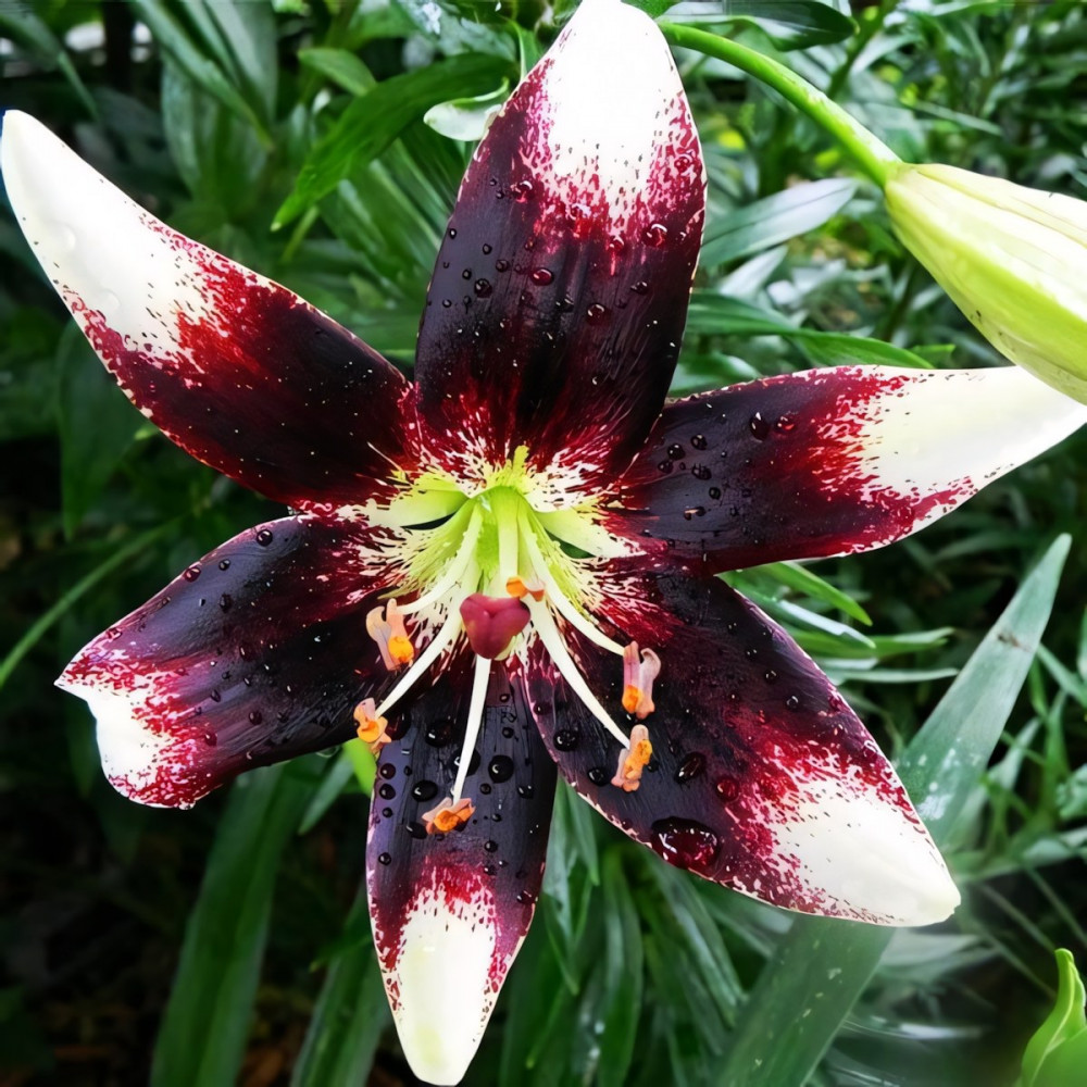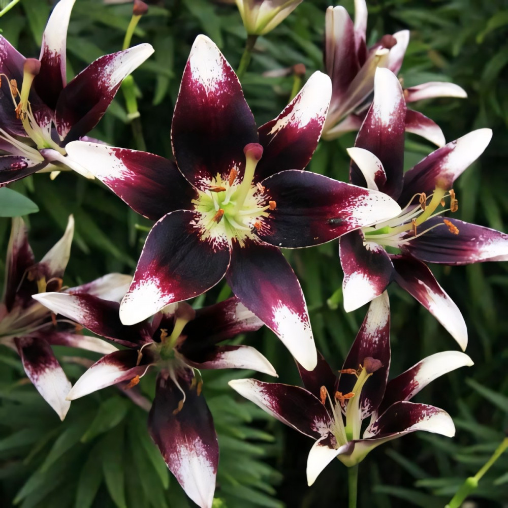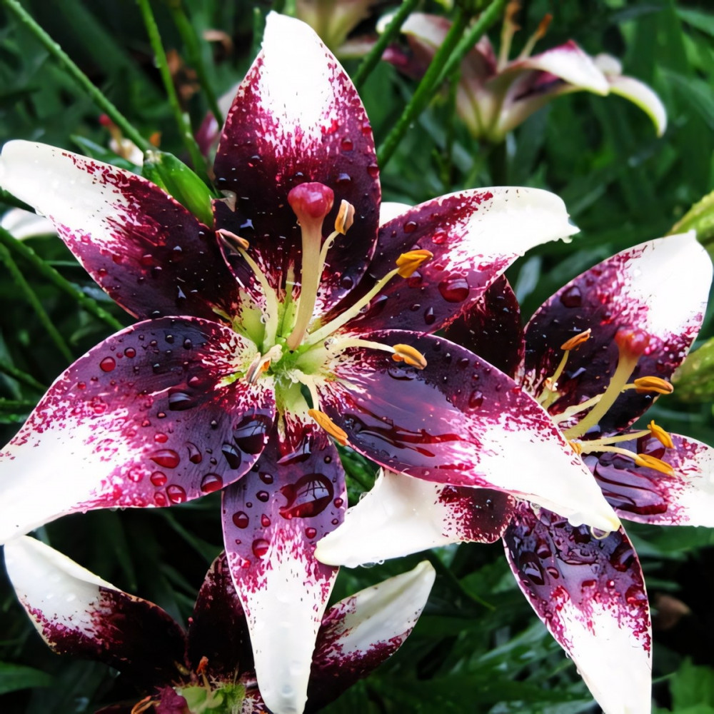 Яркая и изящная лилия! Уникальная окраска делает её поистине шедевром. Цветы этой азиатской красавицы внесут задорный колорит в любую клумбу и букет. Довольно крупные цветы для этого типа лилии представляют собой контрастное сочетание белоснежного и темно-красного цвета. Белоснежный кончик лепестка переходит к основанию в заштрихованный темно-красным цветом. Лепестки симметрично уложенные в бутон раскрывают всю прелесть цветка. Именно потрясающий контраст лепестков, бордовые густые вкрапления широкой полосой располагающиеся у основания белоснежных лепестков, собранных в изящный цветок, являются отличительной чертой этого сорта. Обильное и продолжительное цветение - еще один большой плюс лилии Нэттиз Прайд.