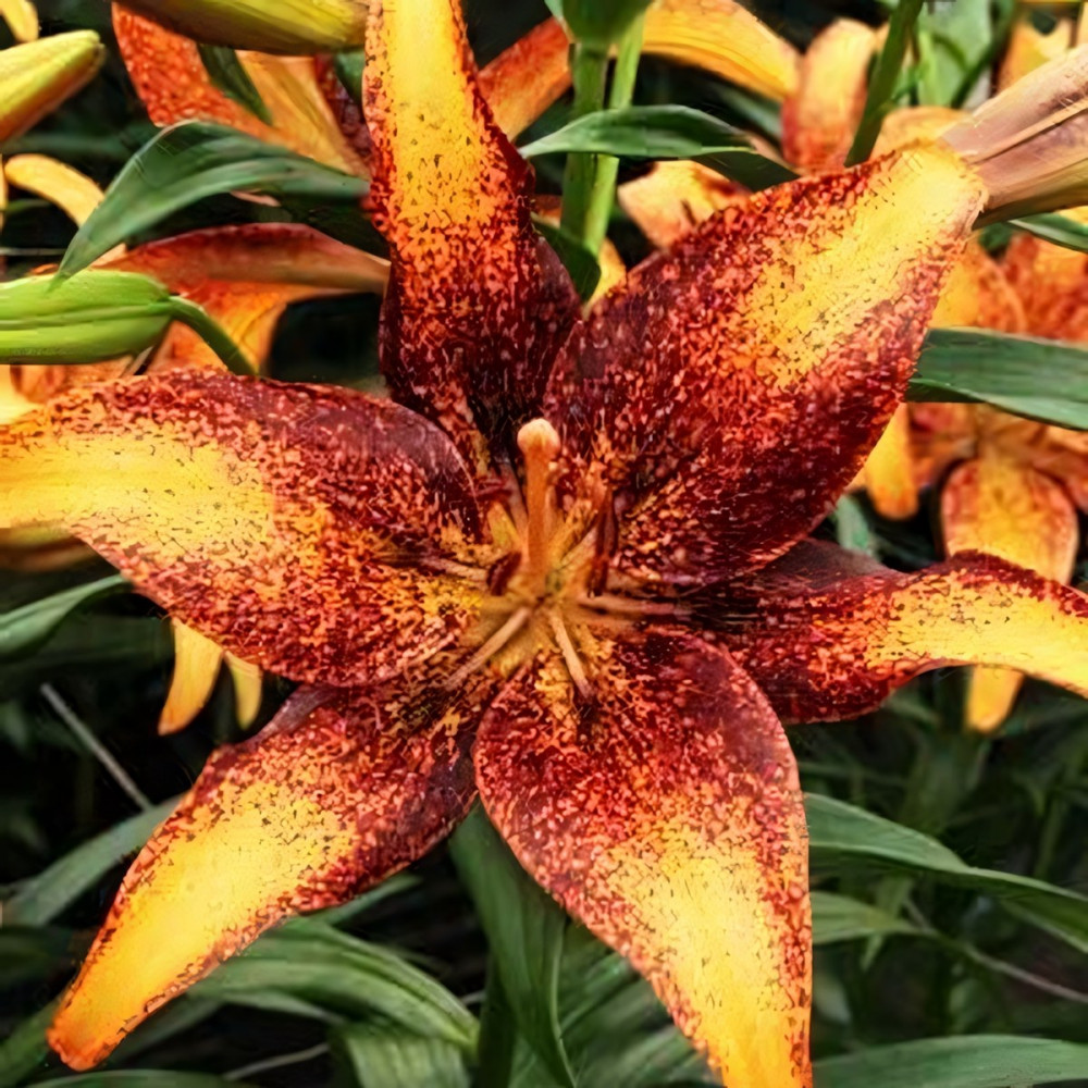 Желто-оранжевый, многочисленные пурпурные крапинки на лепестках, разбросанные по всей площади лепестка и по краям. Высота 110 см, диаметр цветка до 16 см, размер луковицы 12/14.