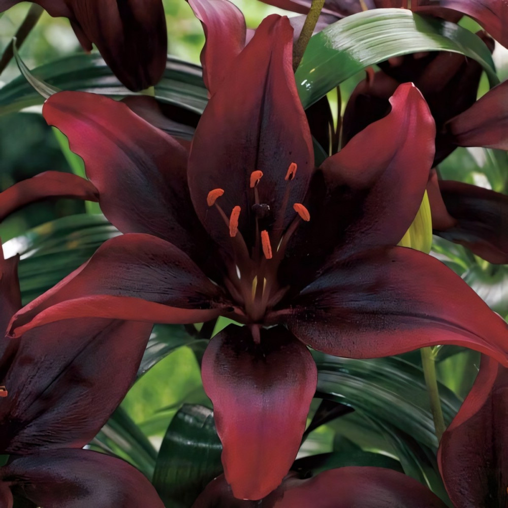 Азиатские гибриды – самый многочисленный раздел, объединяющий более 2000 сортов, перспективных для выращивания повсеместно. Они довольно неприхотливы, отличаются морозостойкостью, быстро и легко размножаются. Цветки разнообразны по форме и окраске. Цветут во второй половине июня-июле. Пригодны для выгонки во внесезонное время. Цветок темно-бордовый с черным оттенком.