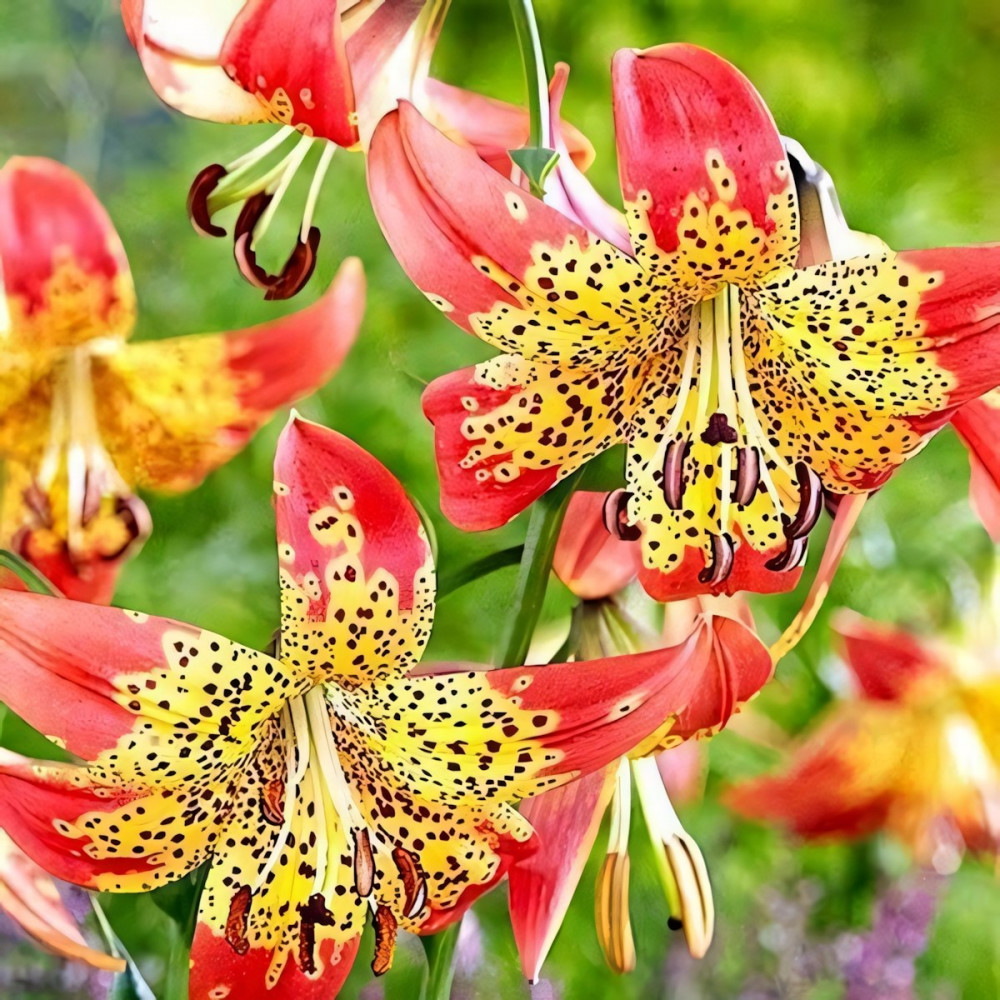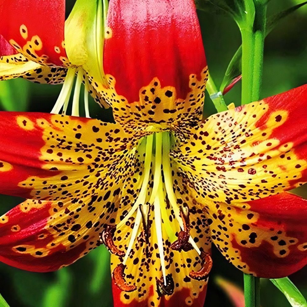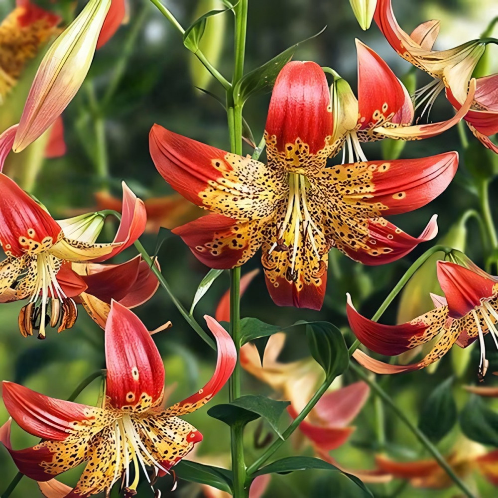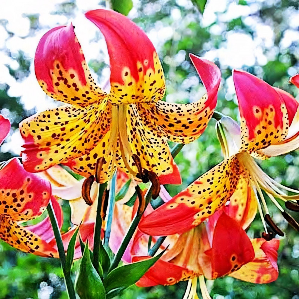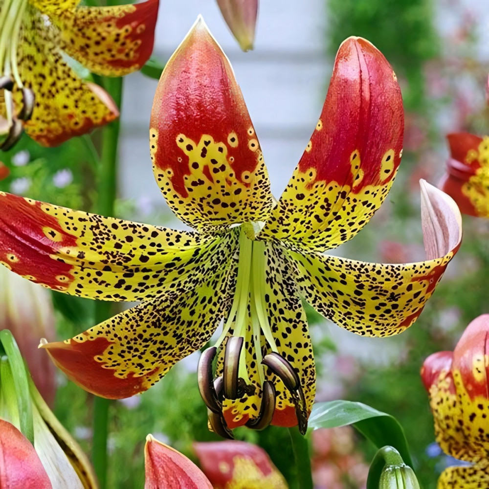 Этот вид отличается своими поникшими вниз цветками. Цветки смотрятся необычно из-за чалмовидной формы, с загнутыми волнистыми лепестками, и эффектными длинными тычинками. Окрас цветков ярко-желтый с крупным частым темно-бордовым крапом и красно-оранжевыми кончиками. Аромат насыщенный, сильный.