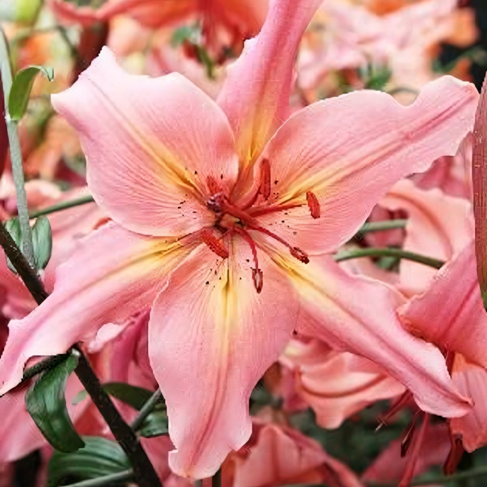 Нежно-розовый с жёлтым центром. Высота 130 см, диаметр цветка до 16 см, размер луковицы 12/14.