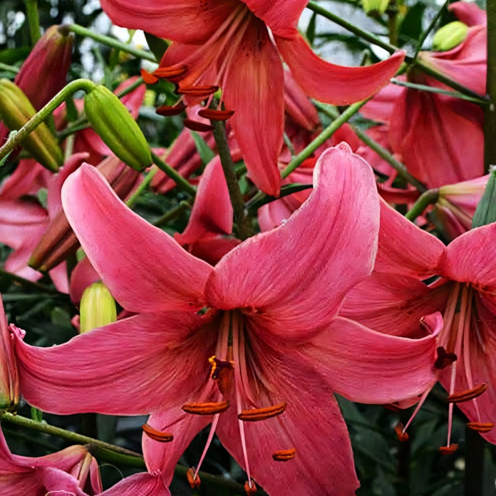 Название сорта звучит в переводе как «Розовый полет». Поникающие цветки глубокого кораллово-розового цвета и с рыжими пыльниками для акцента. Длинные цветоножки хорошо расположены вдоль высоких стеблей. Цветки обращены вниз и не имеют аромата.