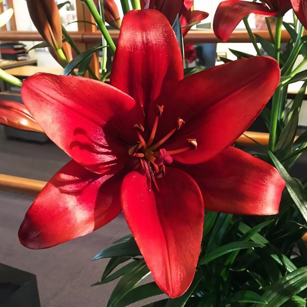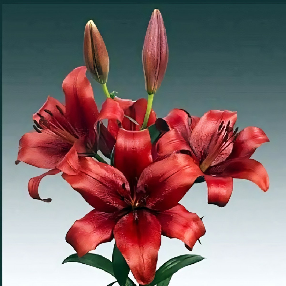 Очень яркий сорт. Лепесток красно-коричневый с насыщенным бордовым крапом. Более 8 цветков на 1 цветоносе у взрослой лилии. Цветок крупный, с тонким нежным ароматом!