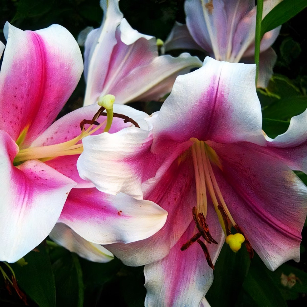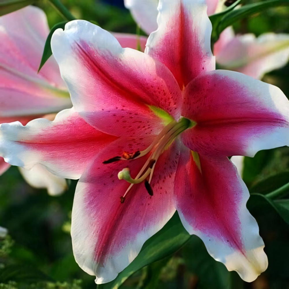 Лилия LOO гибрид Dreamweaver (Дримуивер) - цветки крупные, диаметром 25 см, розовые с белой каймой и темно-розовыми лучами, воронковидной формы, растущие в верх и в сторону. Зацветает в конце июня-первой половине июля. Имеет тонкий нежный аромат. Высота растения 110 см. Время посадки осенью - август-сентябрь или весной - в мае.