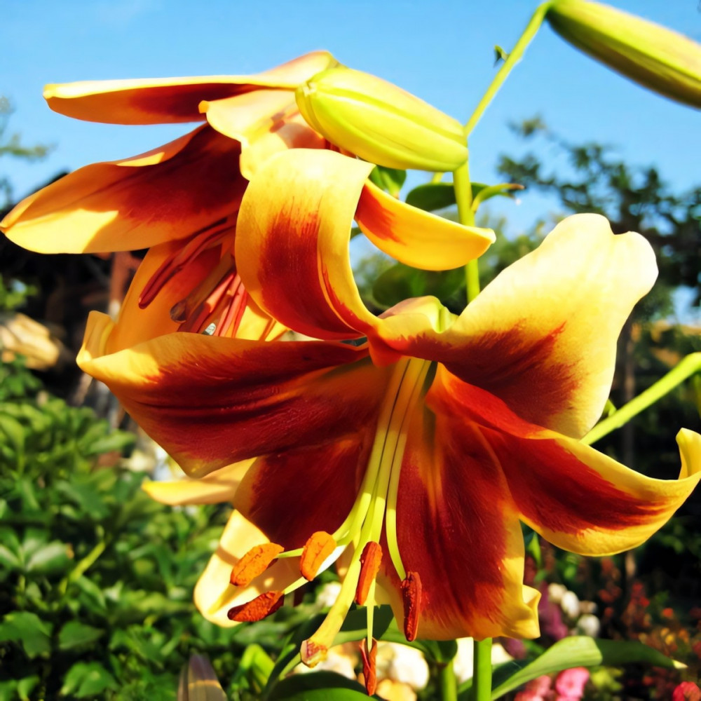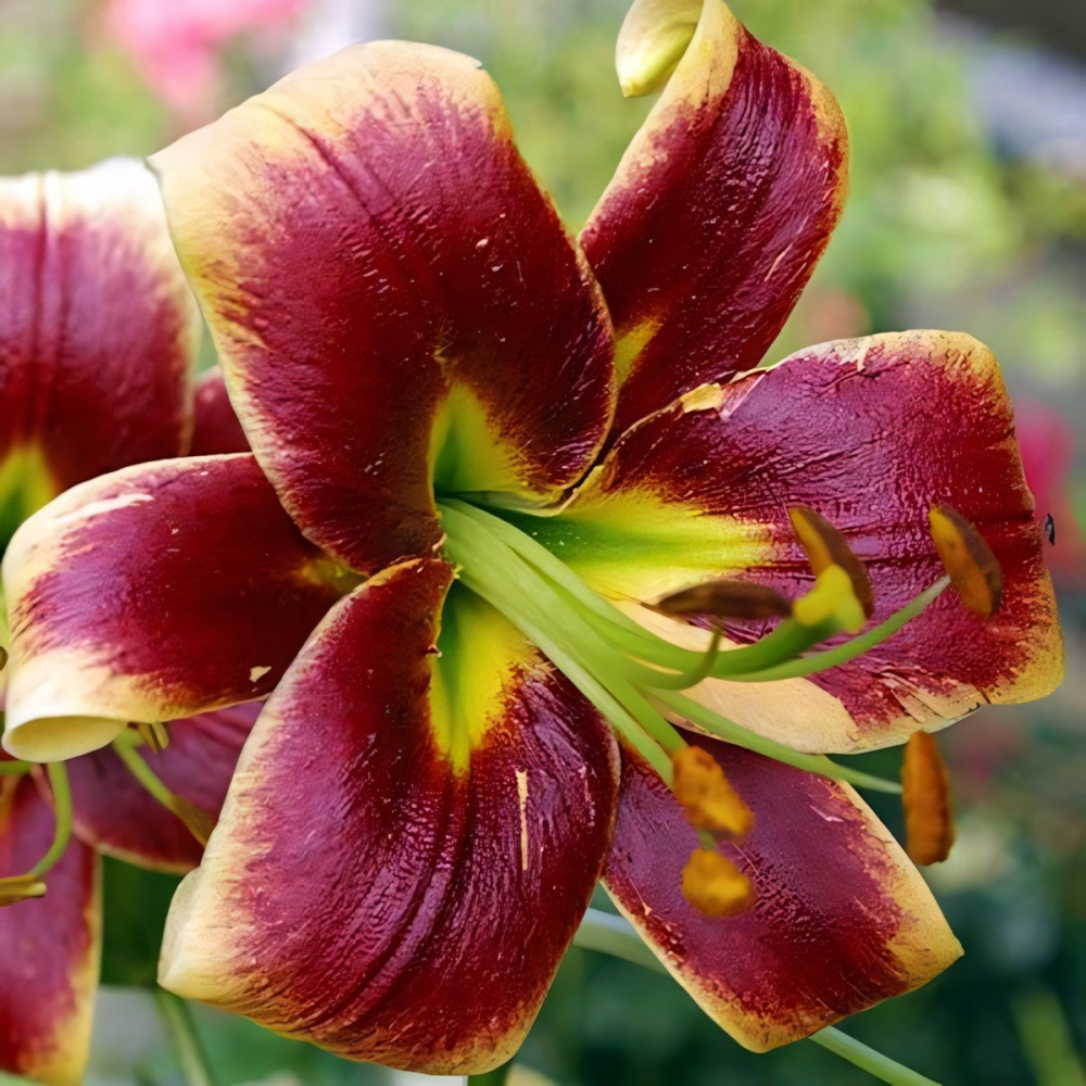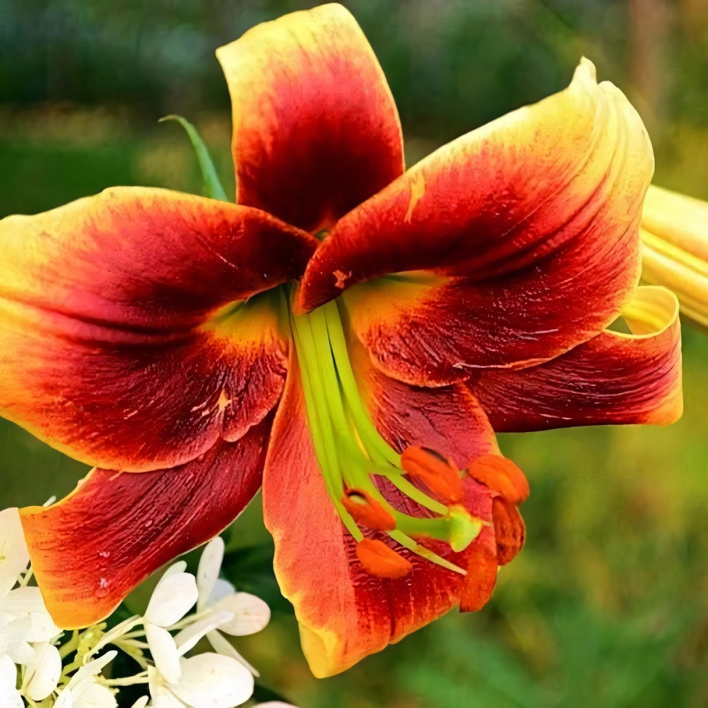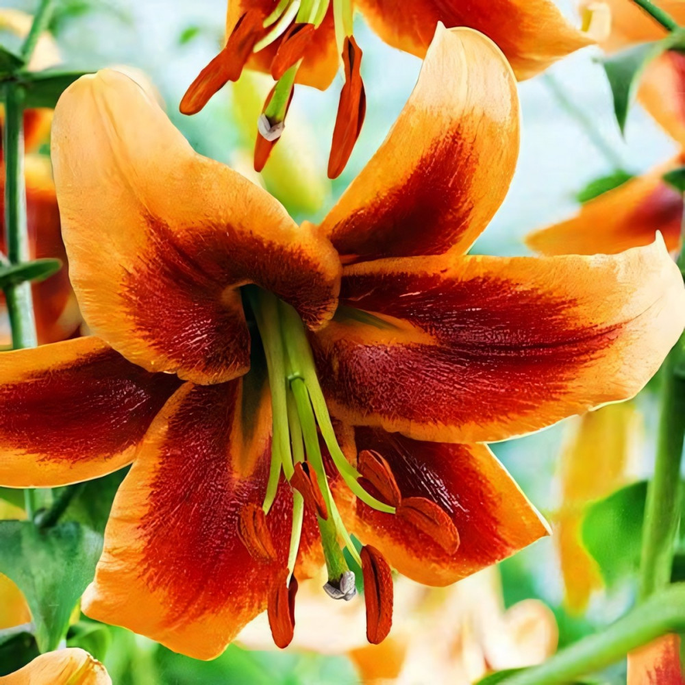 Очаровывает большими красивым цветками и нежным ароматом. Лепестки цветков насыщенного красно-оранжевого цвета с желтой каймой. Состоят из 6 лепестков. Их рекомендуется высаживать на переднем плане в цветниках, а также их можно выращивать в горшках и для срезки. Выращивать дома не рекомендуется из-за большого количества пыльцы.