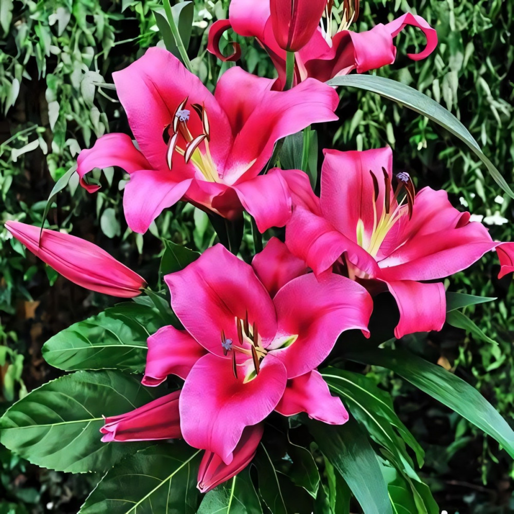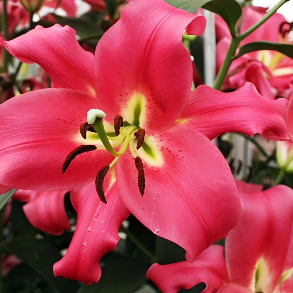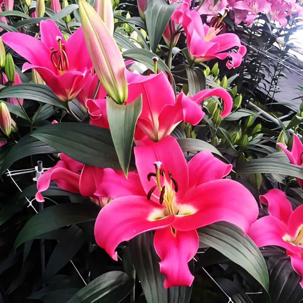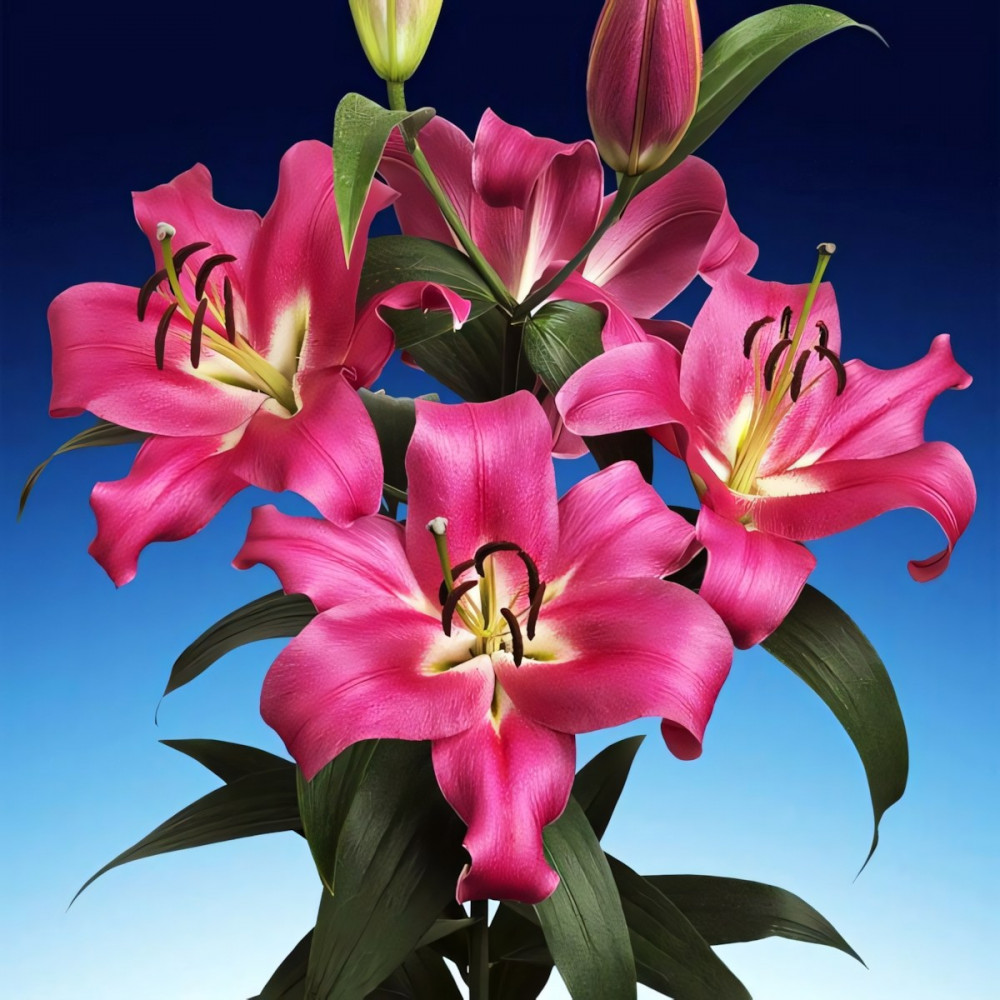 Высокорослый сорт с очень крупными цветками. Лепестки имеют насыщенную окраску цвета фуксии с более светлым центром и коричневыми пыльниками. Цветки смотрят вверх.