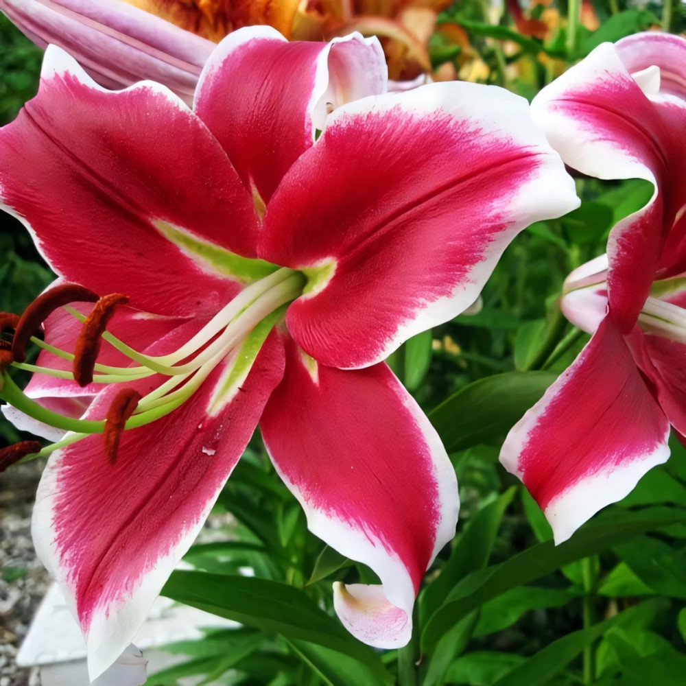 Как и главная героиня известных детективов Агаты Кристи, лилия Miss Marple (Мисс Марпл) быстро отгадает ваши скрытые желания касаемо ее цветения и также оперативно воплотит их в реальность. Рослые растения начинают цвести среди жаркого лета. И чем выше температура воздуха и сильней солнечные лучи, тем пышней и богаче будет цветение сорта. Его крупным малиновым соцветиям не страшен эффект выгорания, на лепестках не появляются солнечные ожоги и «веснушки». Основная ягодная окраска цветков разбавлена сиреневым отливом, а роскошь такого сочетания оттенков подчеркнута кремово-желтым кантом.