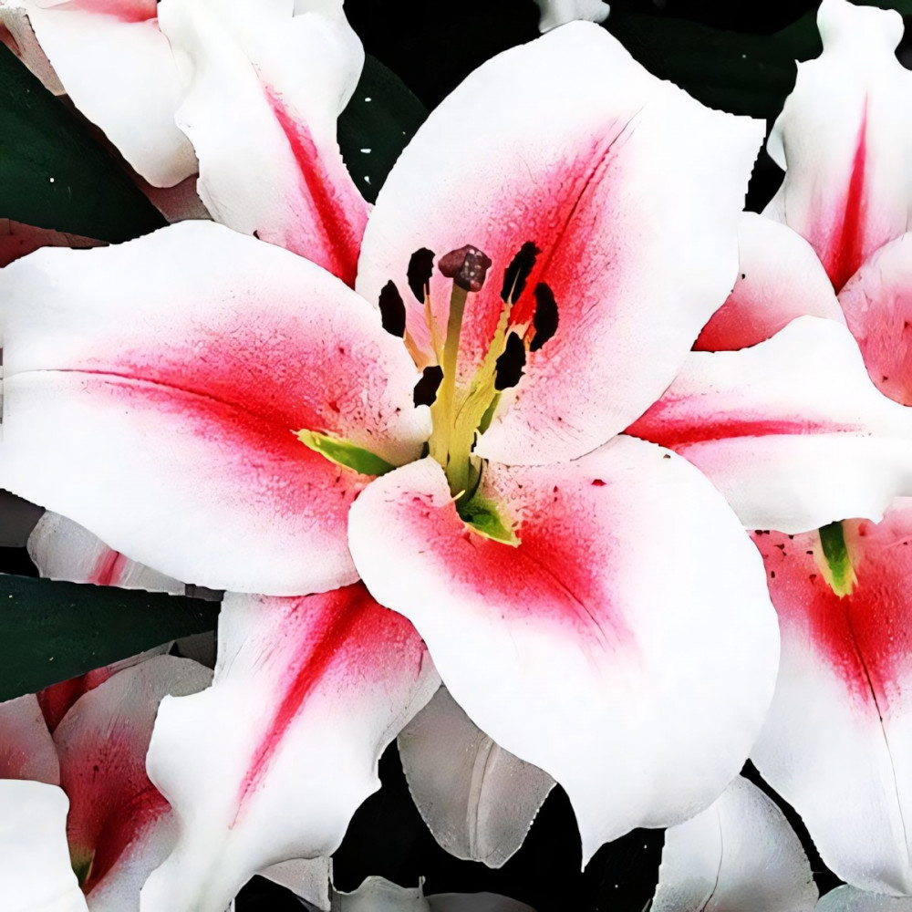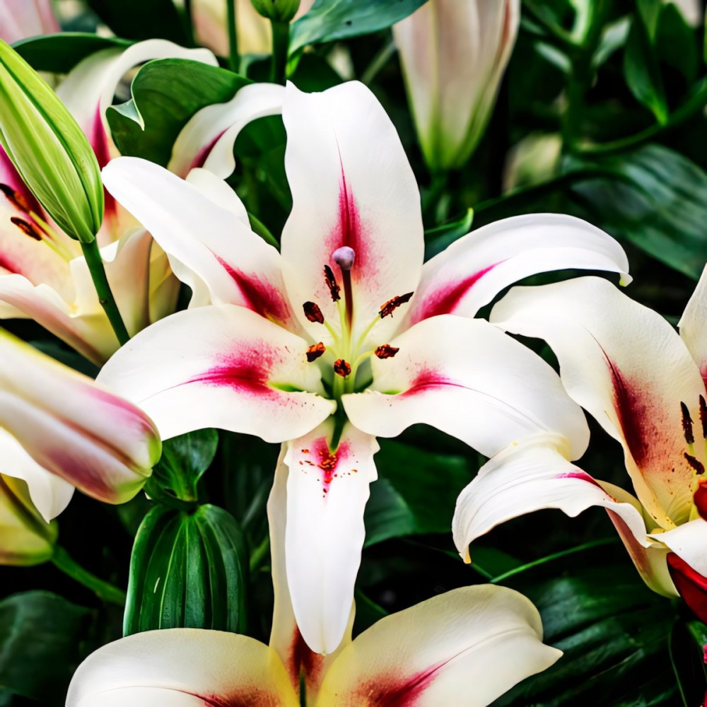 Новый сорт в линейке ОТ гибридов. Цветок белый с красно-малиновыми мазками до середины лепестков и легким напылением у центра. Стебли прочные, жесткие. Очень приятный аромат!