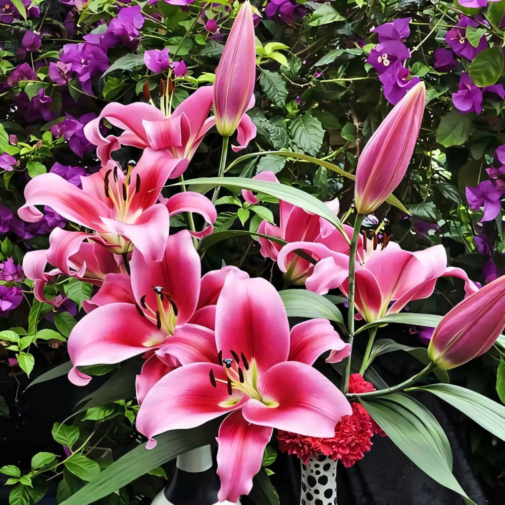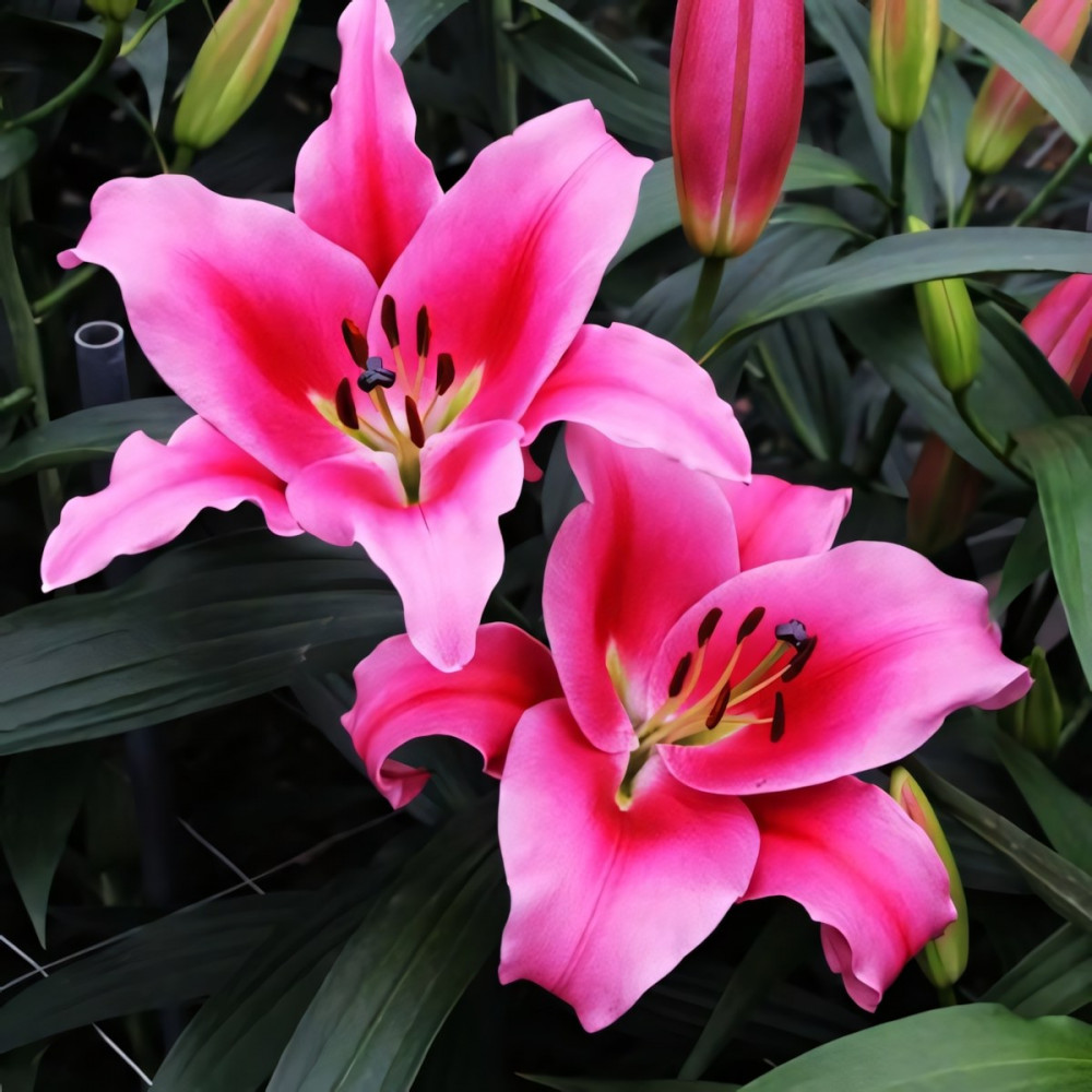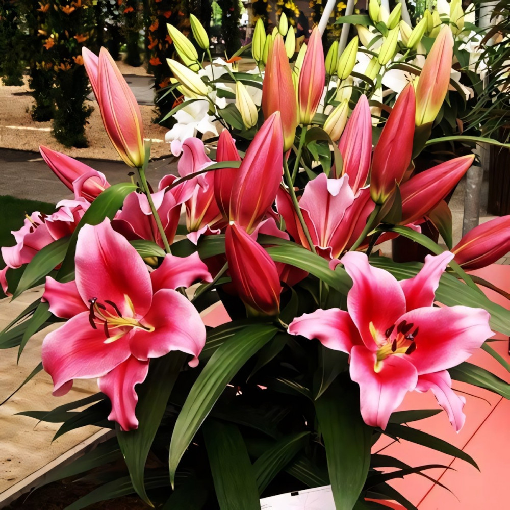 Лилия ОТ гибрид Dalian (Далиан) - имеет большие цветки с махровыми лепестками малинового оттенка. Центр цветка - ярко желтый. Аромат интенсивный. Стебли высокие, густо покрыты темно-зелеными листьями. Для оптимального внешнего вида рекомендуется высаживать группами до 5 луковиц, нуждается в опоре.