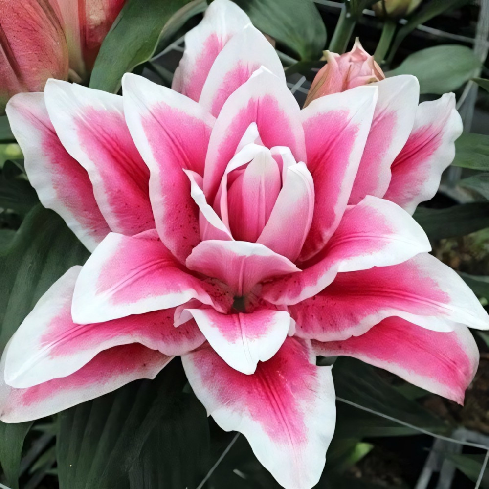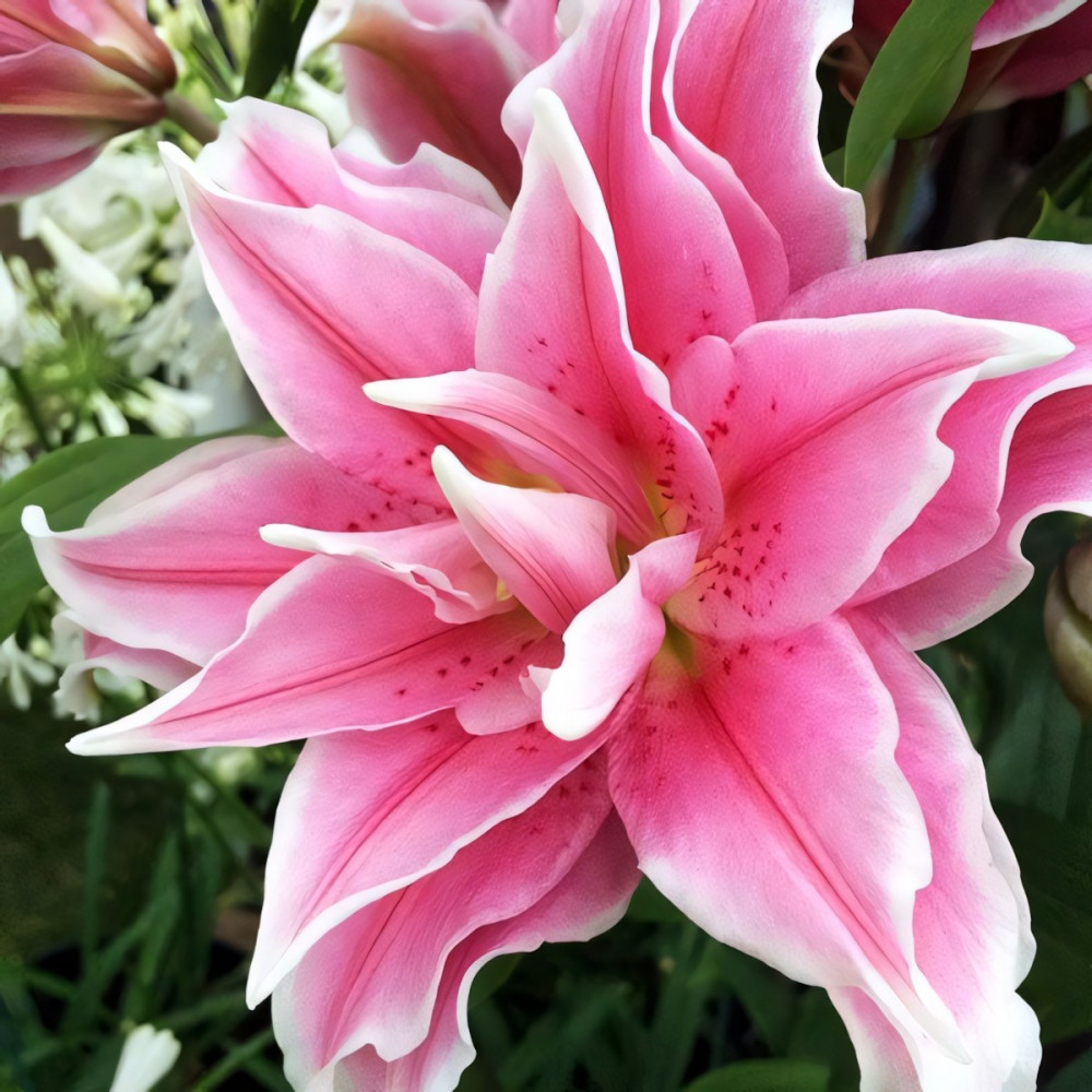 Розовидная лилия, выглядит потрясающе, ее объемные махровые цветки украшают собой клумбу или букет, а благоухание разносится по всему саду. Пышные цветки имеют ярко-розовый окрас и украшены белой каймой. Данный сорт отличается стойкостью к заморозкам и негативным факторам.