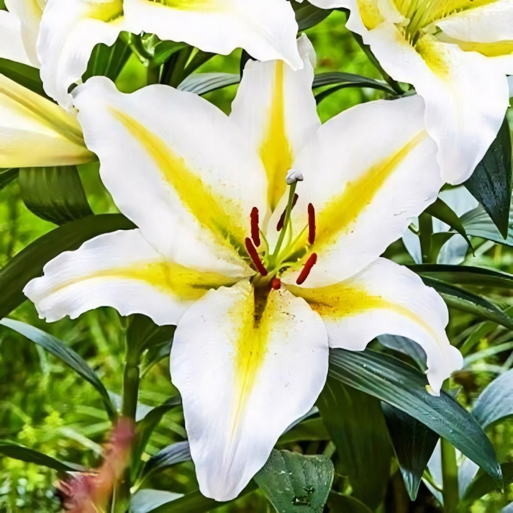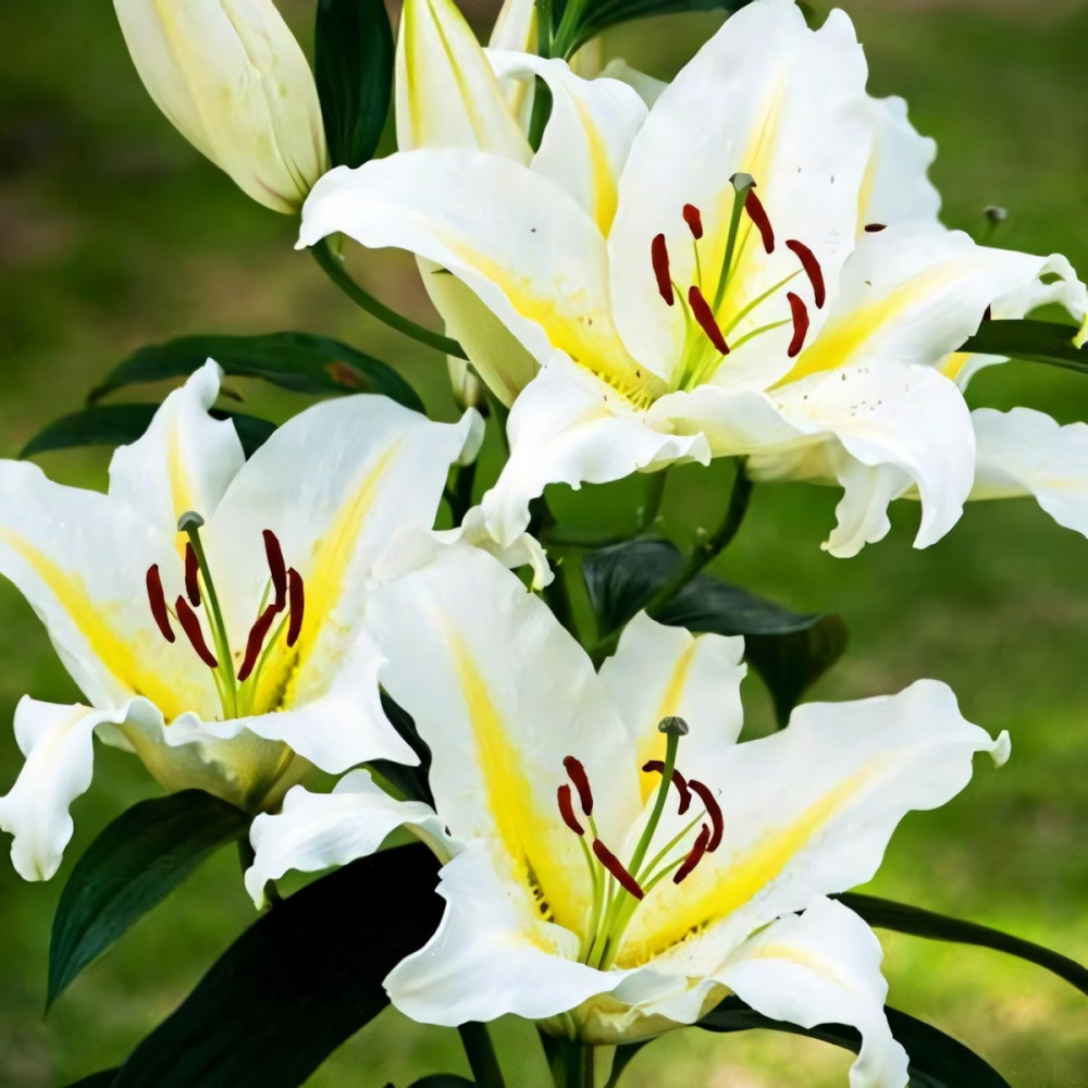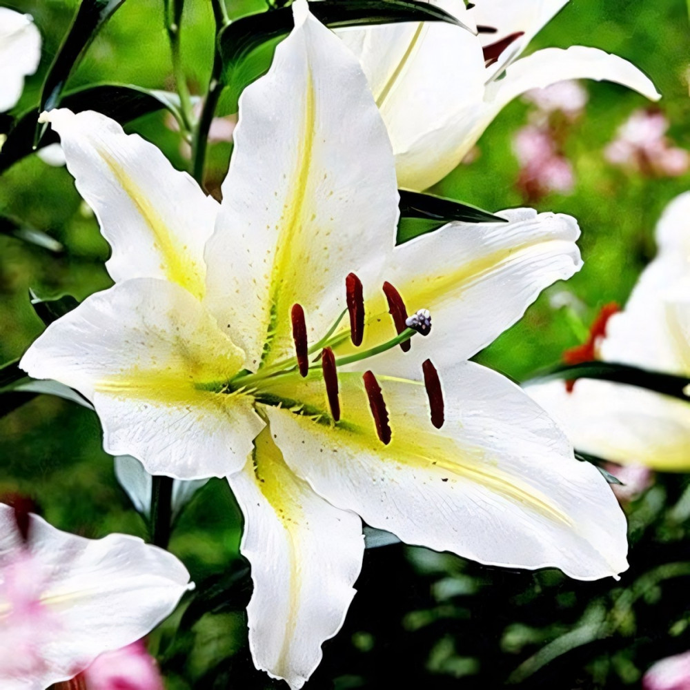 Лилия восточная Bufferi (Бафферари)- белоснежная красавица с золотой звездой в центре прекрасно смотрится в букете. А цветение этой лилии в саду невозможно сохранить в тайне: сладкий аромат, растекающийся по саду призывает всех найти его прекрасный источник и полюбоваться. Диаметр цветка 25м.