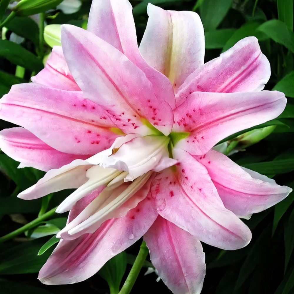 Цветки нежно-розовые с белым кантом и небольшим красным крапом у центра.Обладает очень сильным ароматом. Цветение июль- август.
