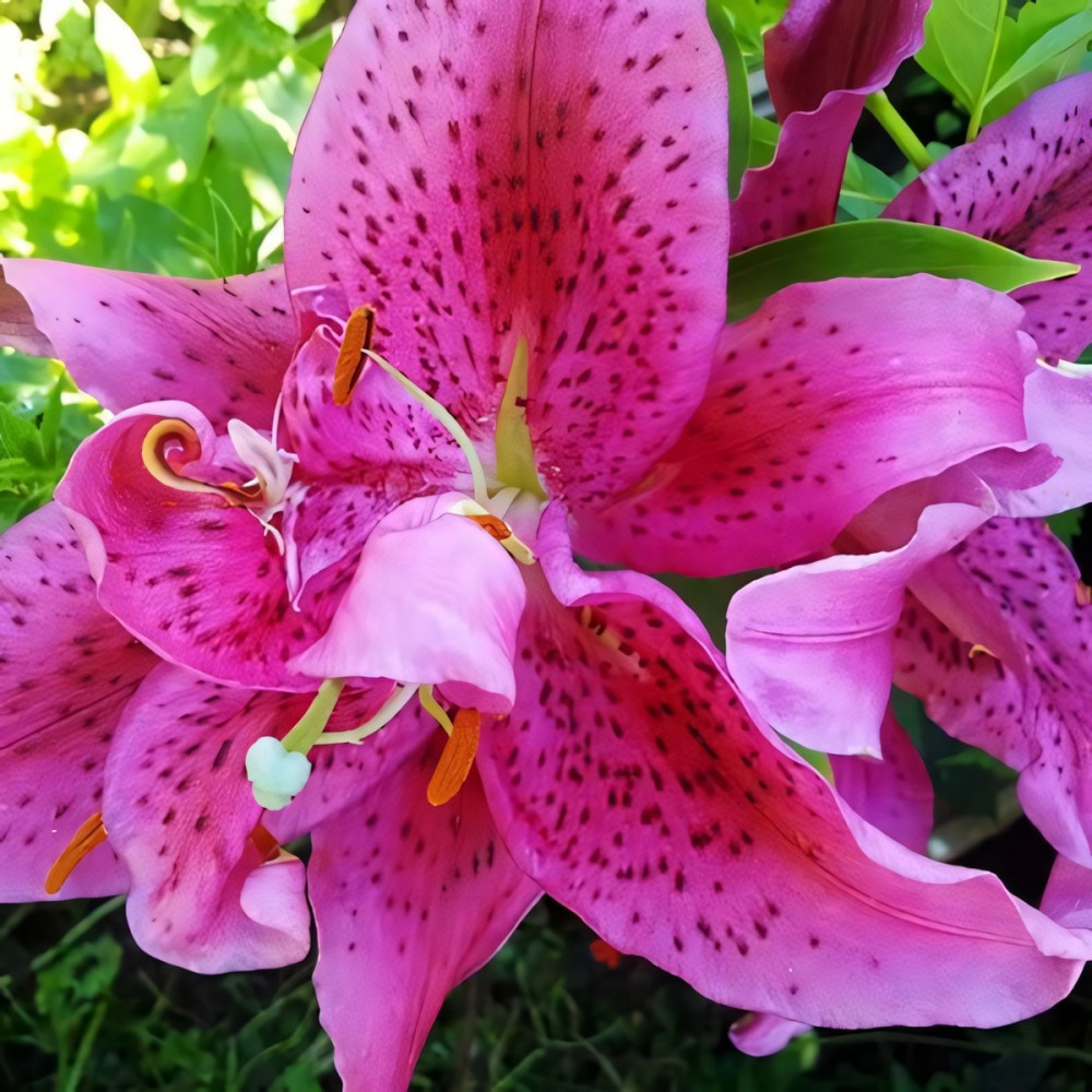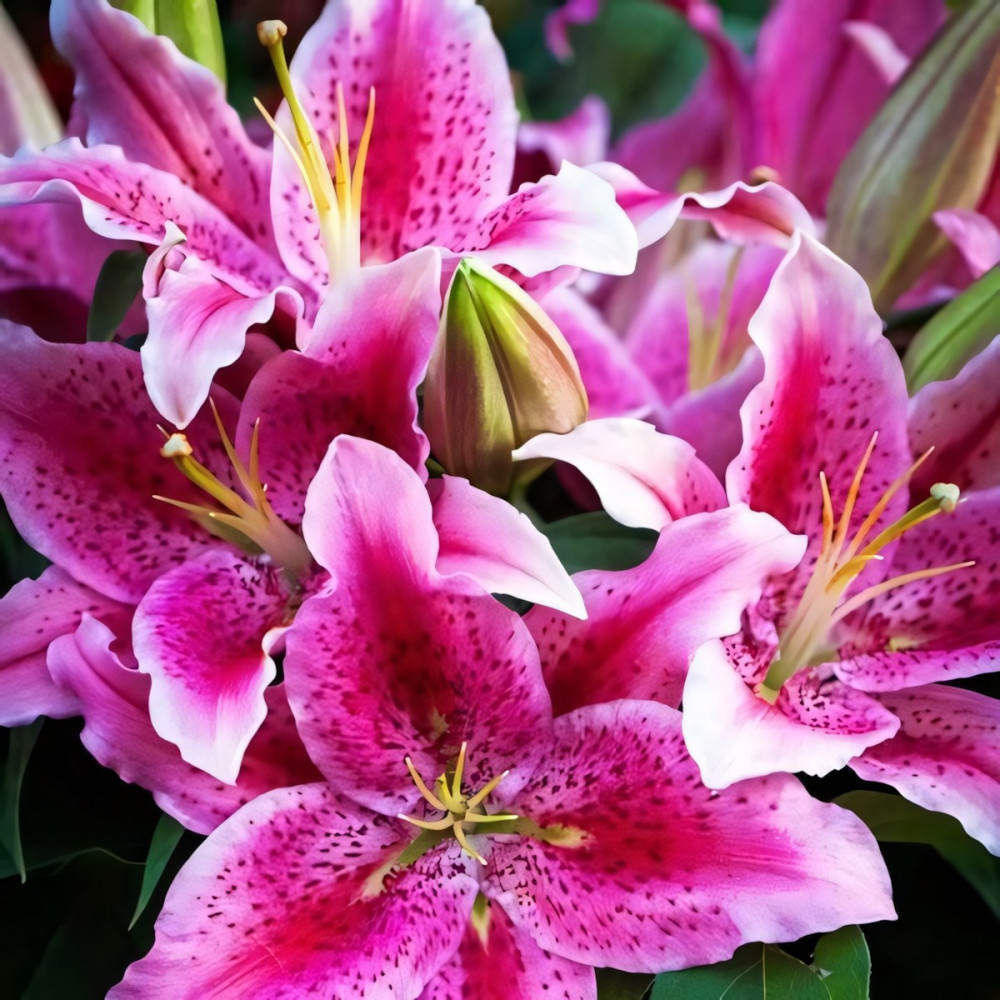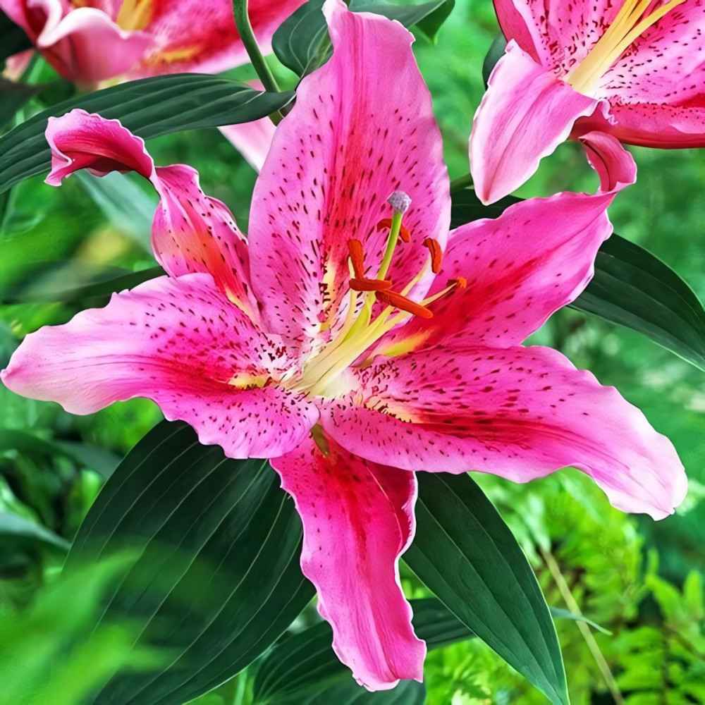 Считается самым ярким и ароматным представителем ориентальных гибридов. Крупные бутоны украшены ярко-розовыми лепестками с красным крапом, центр - золотистый. Стебли крепкие, густо укрыты темными блестящими листьями. Подходит для цветников и клумб, а также для выращивания под срез.