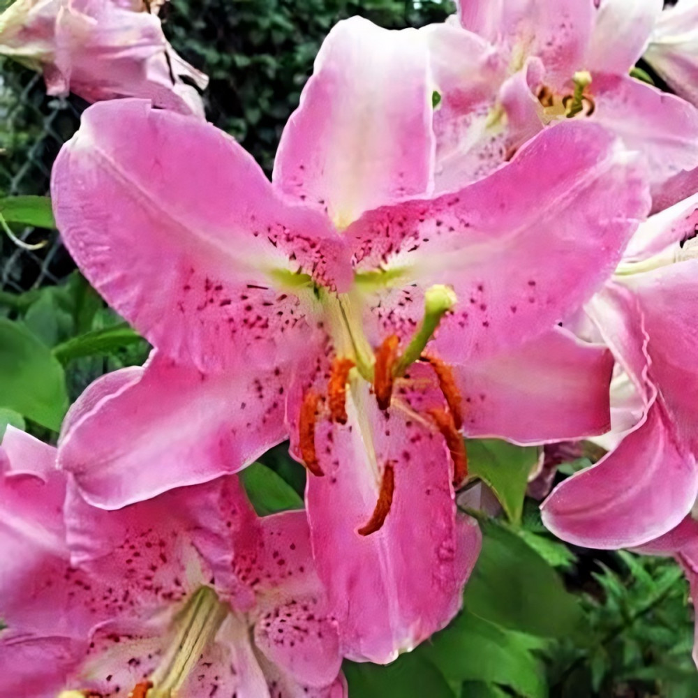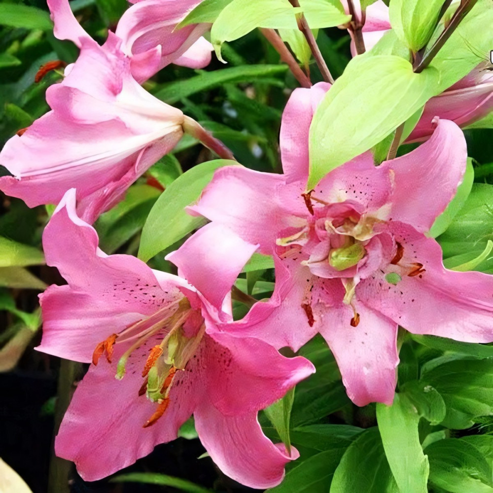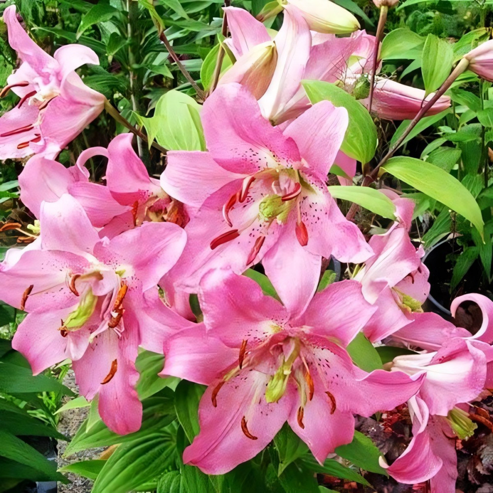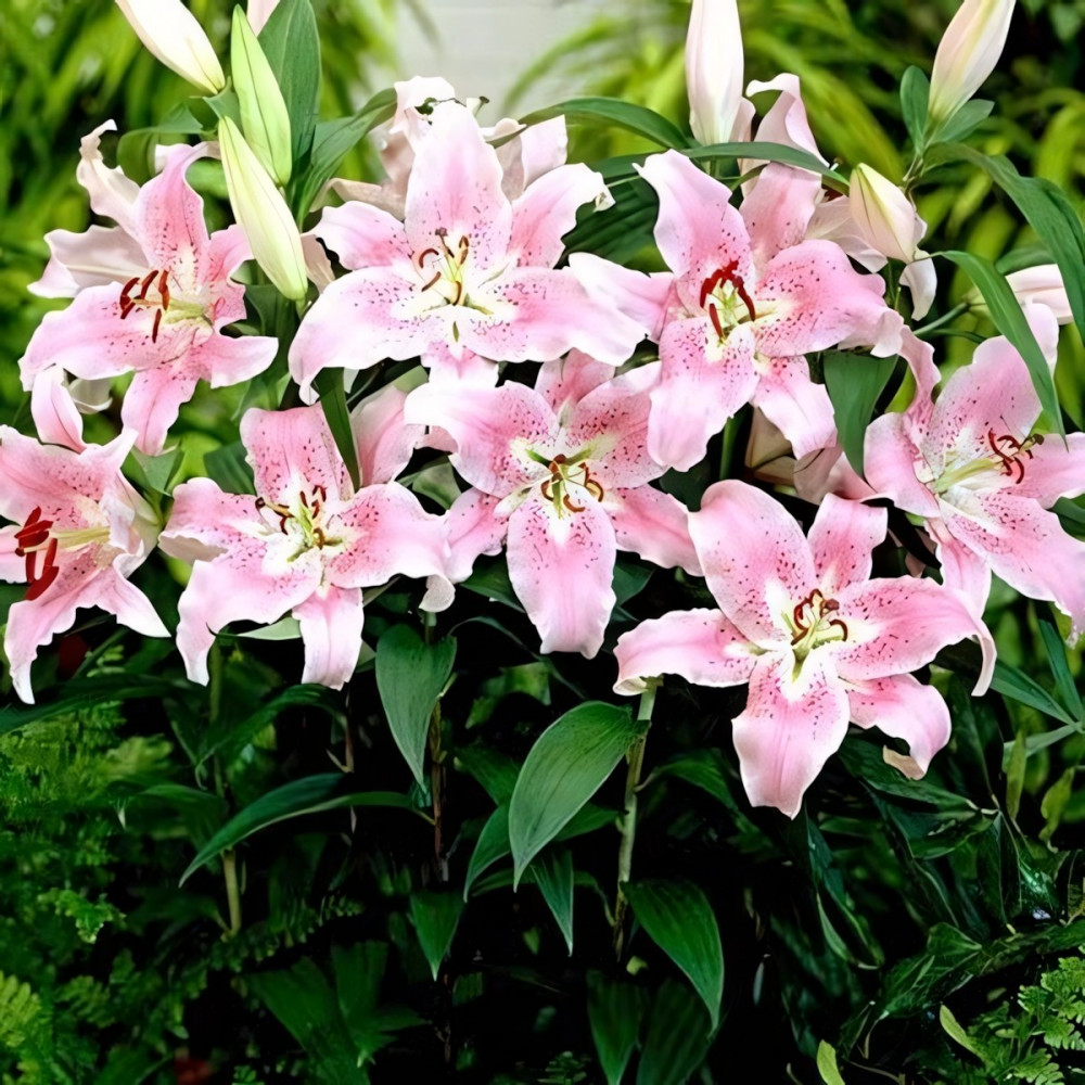 Лилия восточная Farolito (Фаролито) - компактные, немного махровые, нежно-розовые цветы лилии Фаролито необычайно декоративны. Распускаются по 2-3 на крепких цветоносах с темно-зелеными листьями. Лепестки слегка волнистые, остроконечные, отогнуты назад. Переливы розовых оттенков, мелкий крап бордового цвета, темно-коричневые пыльники – все это делает цветок одновременно и нежным, и ярким. Диаметр цветка 15 см, высота 50 см. Прекрасно подходит для выращивания не только на первом плане цветника, но и в вазонах на террасе или балконе (для горшечного выращивания). Хороши на срезку, аромат нежный, приятный. Предпочитает нейтральную или слабокислую хорошо дренированную почву.