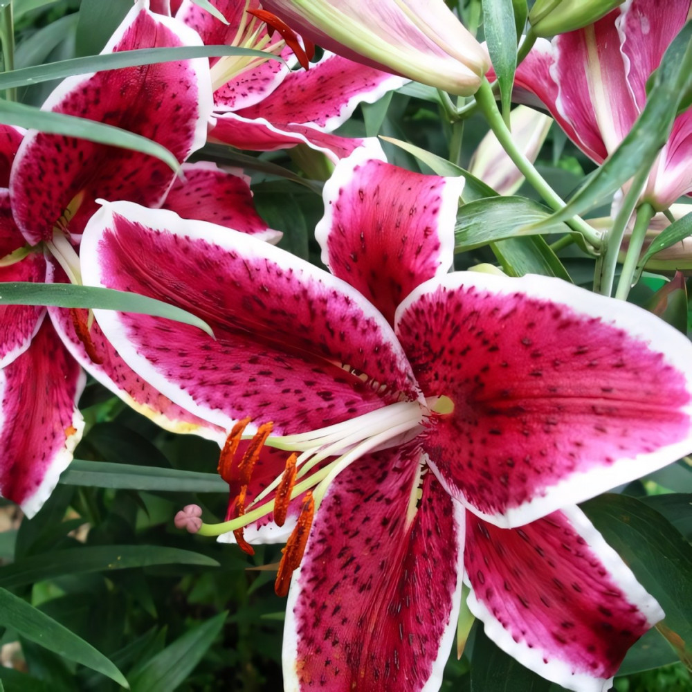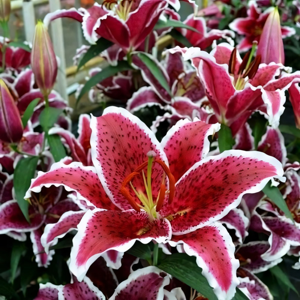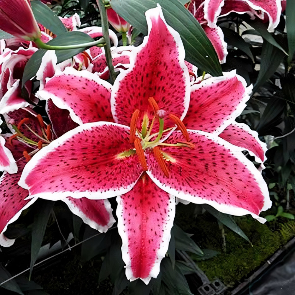 Лилия восточная Front Page (Фронт Пейдж)-Одна из самых нарядных восточных лилий и одна из самых крупных лилий в этой группе. Цветки ярко-розовые (красные) с фиолетово-розовым насыщением по центру и белой каймой, лёгкое гофре с многочисленными бордовыми точками, лепестки звездчатой формы со слегка завернутыми кончиками. Диаметр цветка 25 см, форма звездчатая, направлены вверх. Сильный аромат. Стебель мощный, 110 см высотой. В соцветии 3-9 бутонов (зависит от размера луковицы). Цветение через 100-110 дней после всходов. Хороши в посадках заднего плана.