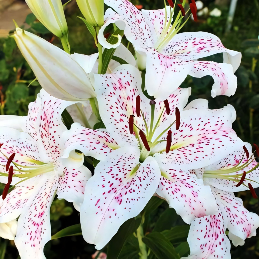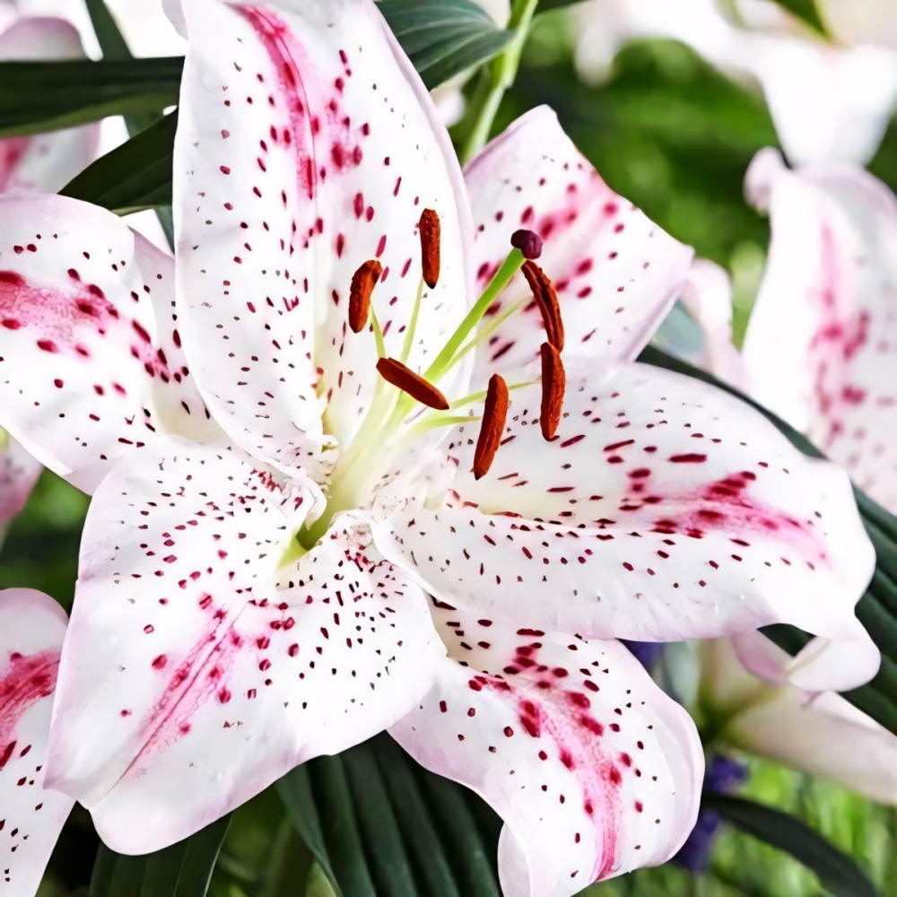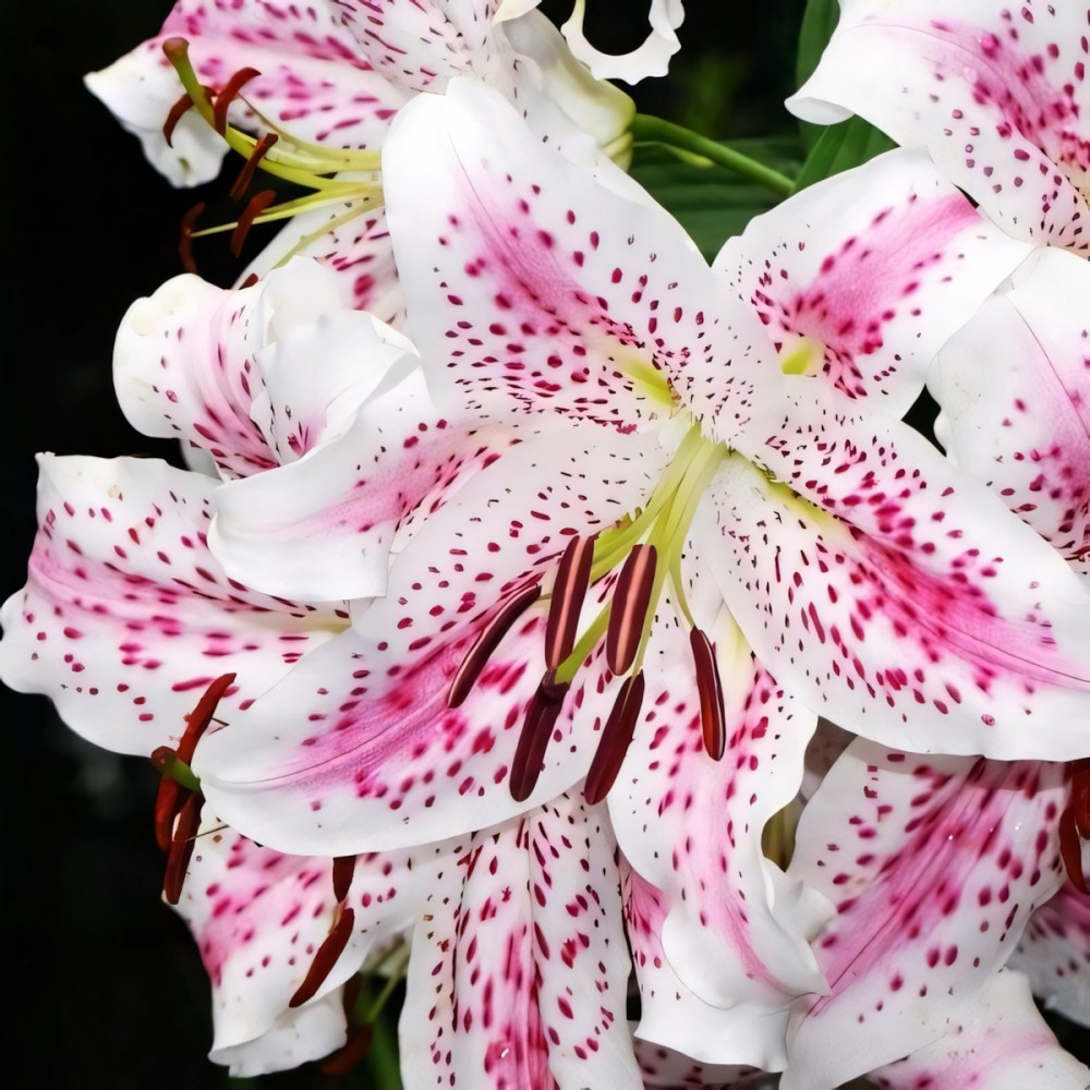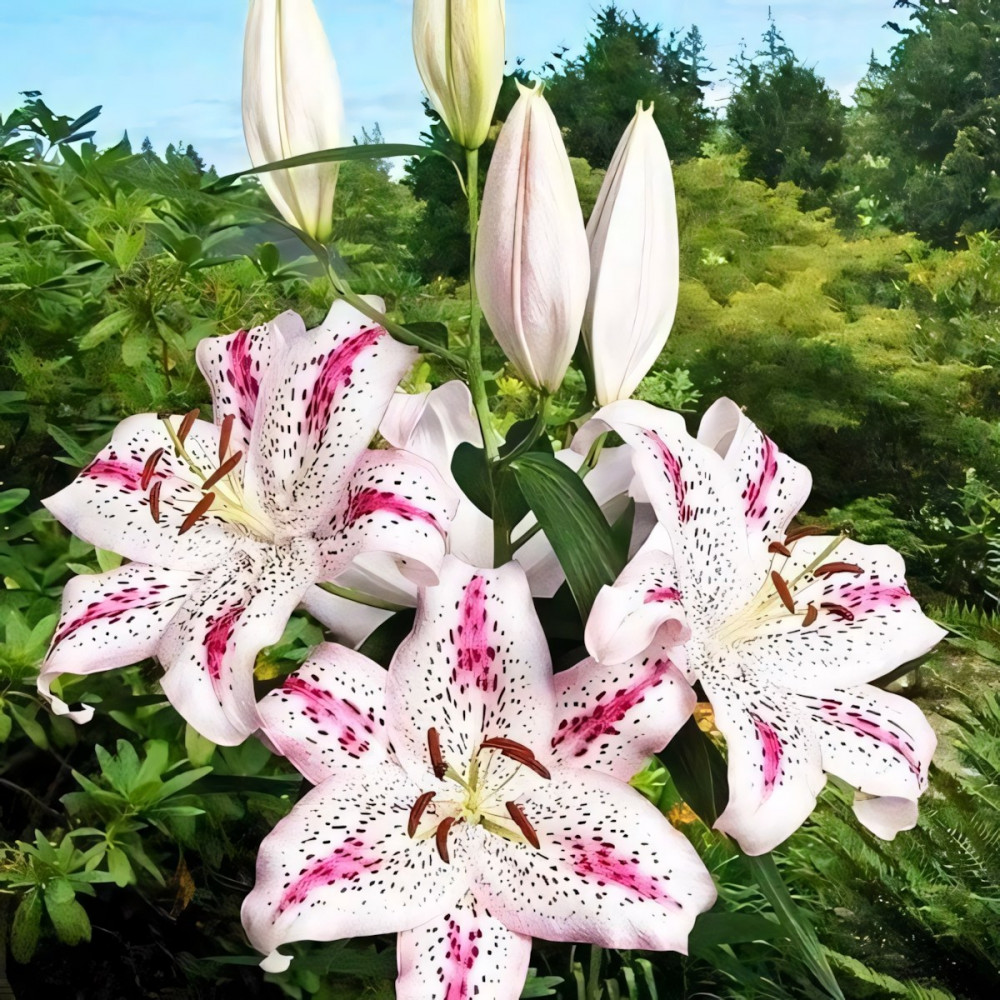 Очень эффектный сорт. Белая лилия с темно-розовым крапом и розовыми линиями на верхней части лепестка. Цветы ароматные, крупные.