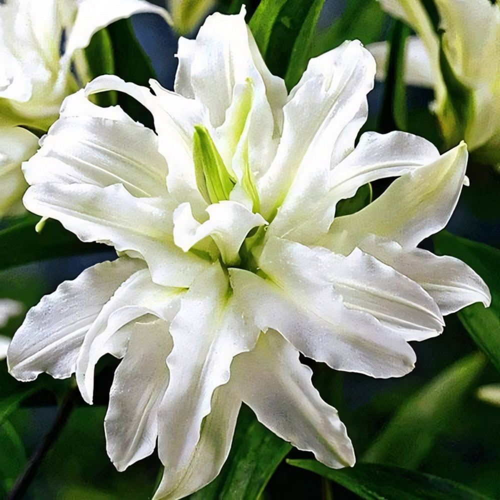 Этот роскошный цветок белоснежного оттенка с нежно-желтым цветом в основании лепестков, напоминает георгину. Лепестки волнистые по краю, сильно отгибаются назад. Тычинки отсутствуют. Крапа нет. На стебле от 2 до 6 цветков. Цветки очень крупные, необычайно привлекательные, ароматные. Polar Star (Полар Стар) широко используется в групповых посадках, миксбордерах, клумбах, на срезку.