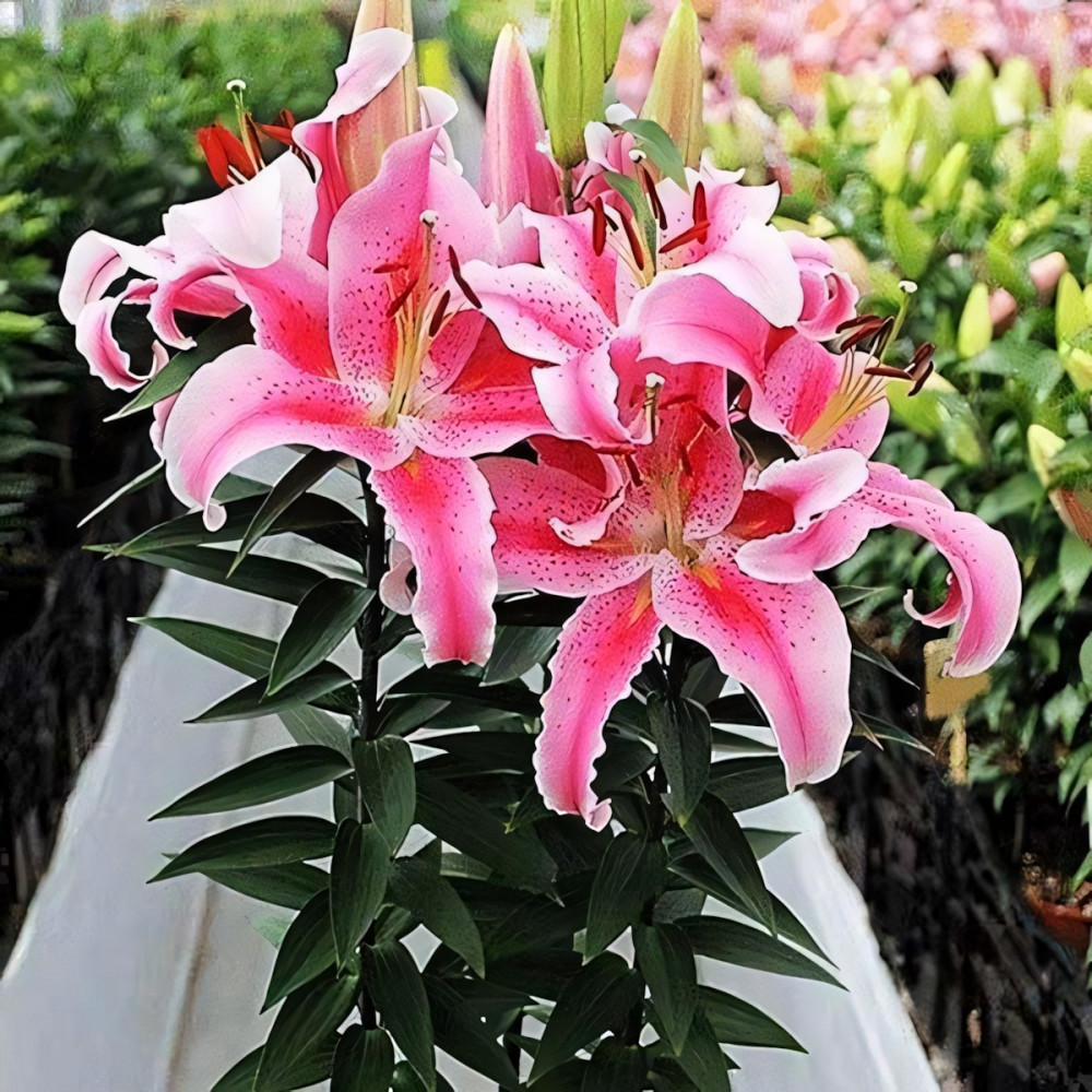Лилия восточная Rapid Romance (Рапид Романс) - цветок ярко-розовый с белой каймой и красным крапом. Сорт низкорослый, компактный. Высота 50-60см. 3-5 бутонов, цветок диаметром 22см. Зацветает через 70--80 дней!