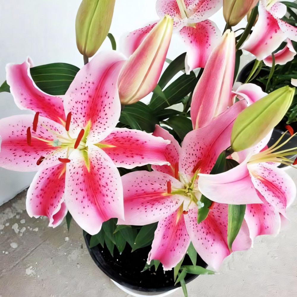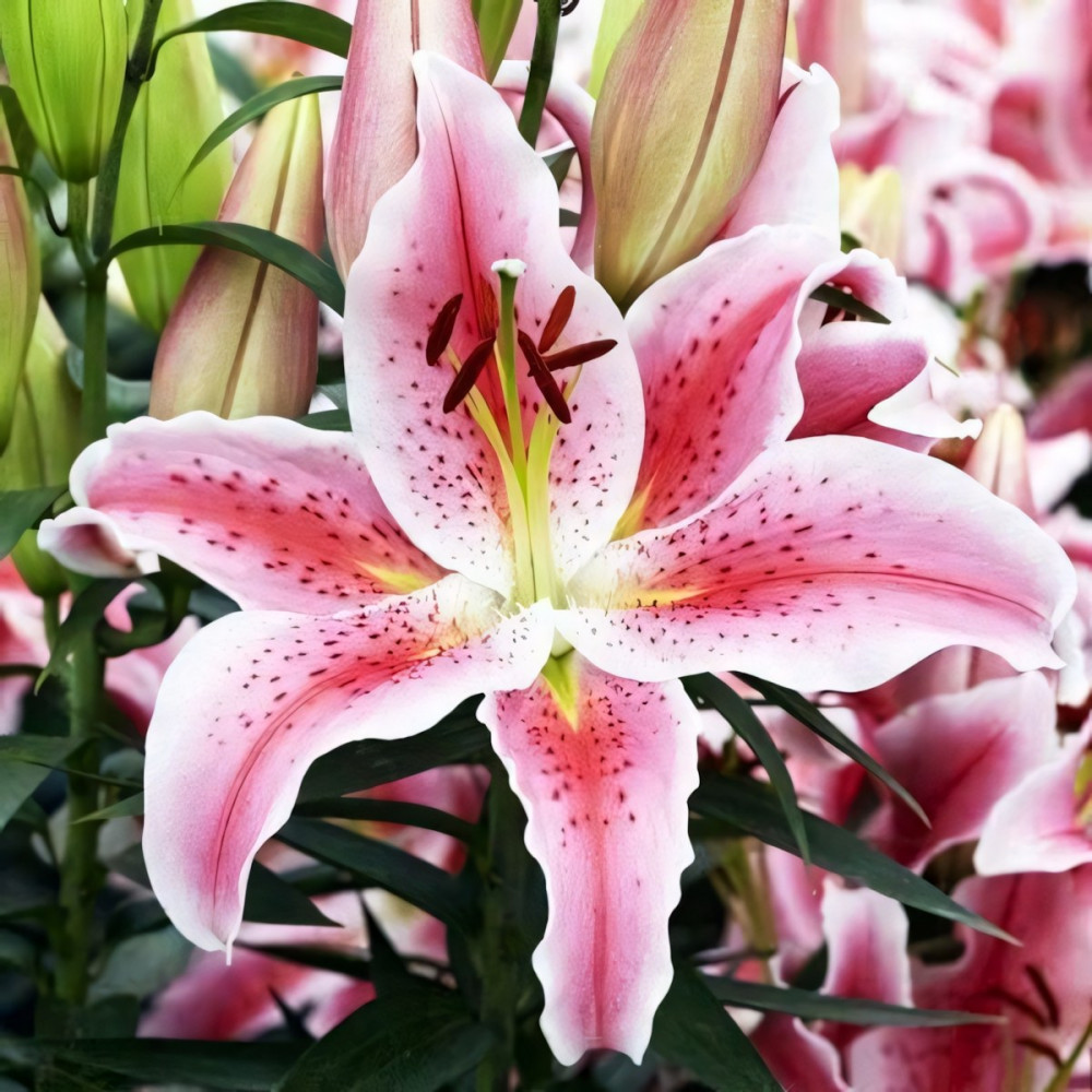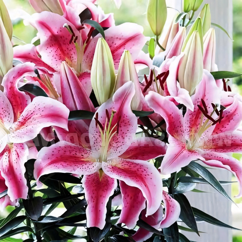 Восточные лилии создают неповторимую роскошь и обволакивают сад пьянящим ароматом. Их огромные соцветия-колокола в разы крупнее, чем у азиатских, видовых или тигровых лилий, а яркая расцветка с характерным крапом делает их самыми узнаваемыми среди остальных групп лилий.