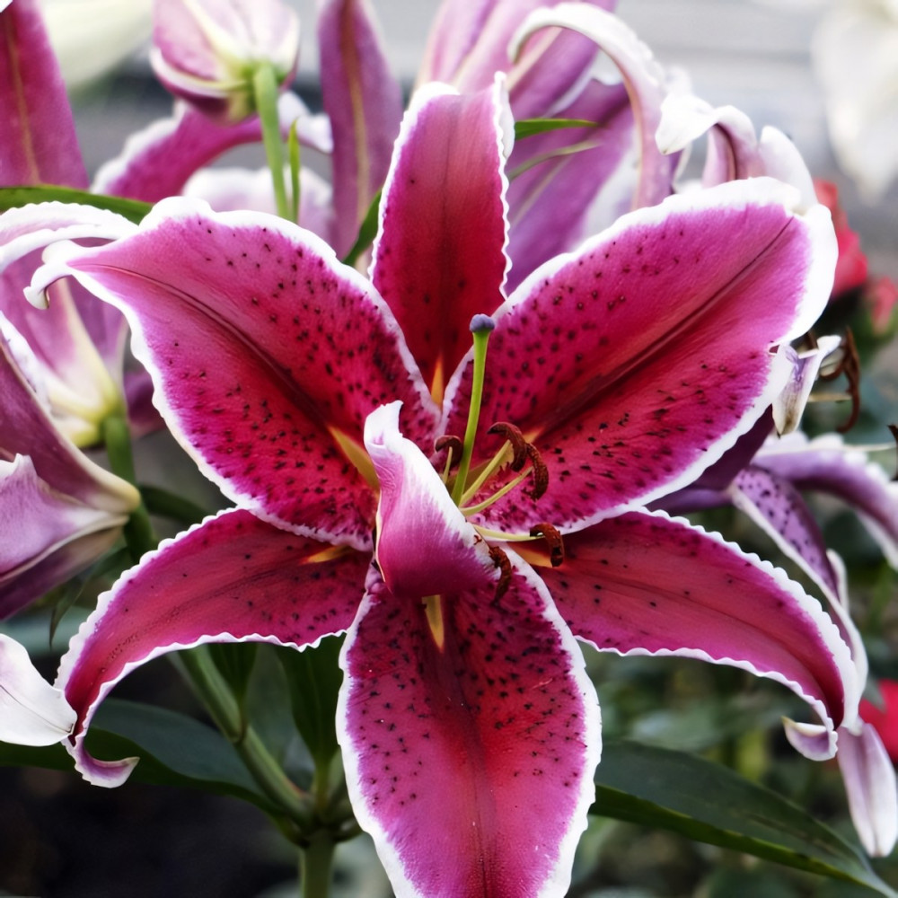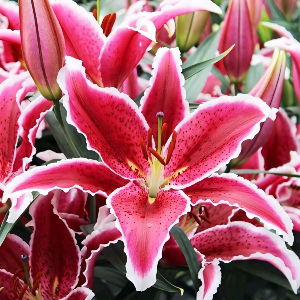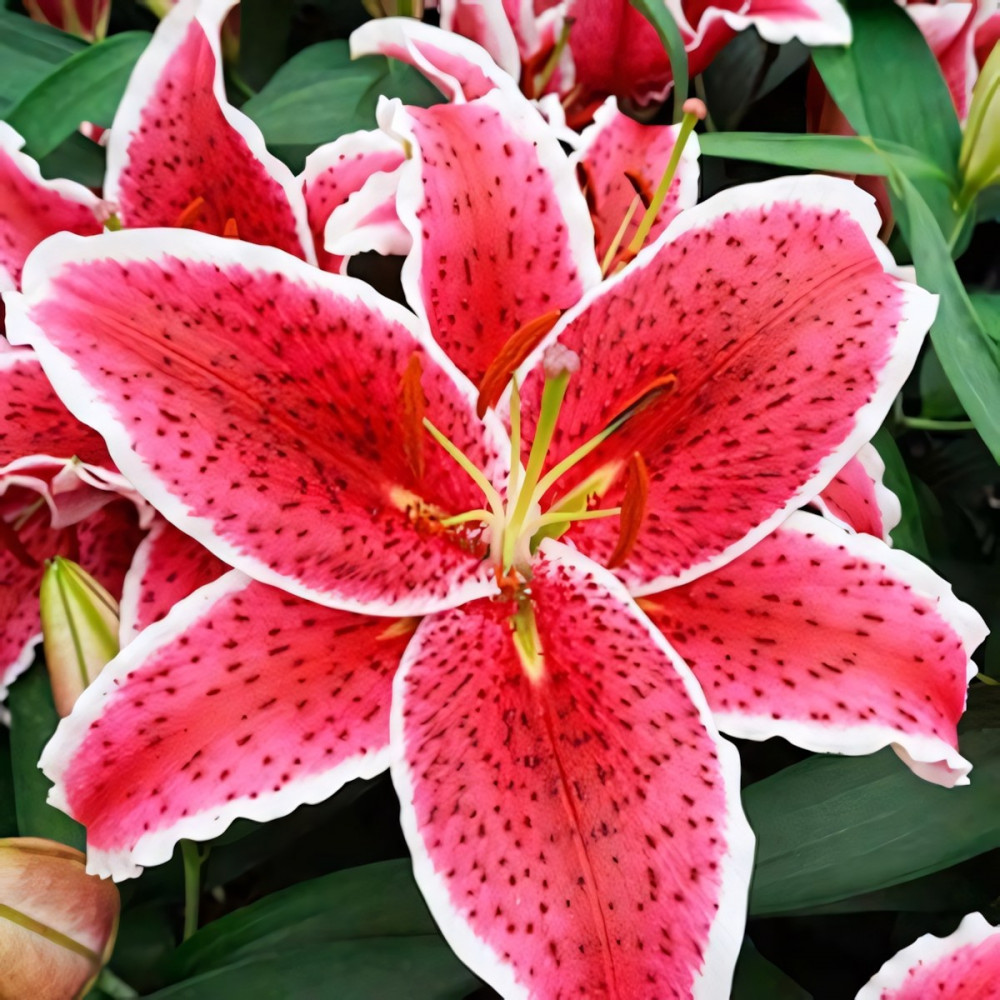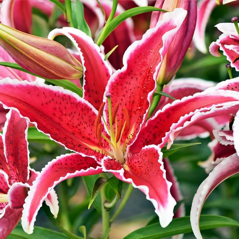 | Период цветенияиюль-август | Стандарт поставкиЛуковица в торфе | Цвет цветкаярко-розовый с тёмным крапом и белой каймой |
