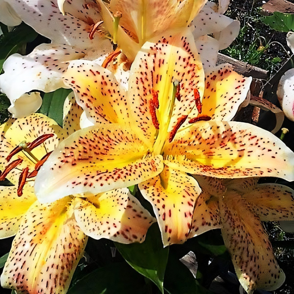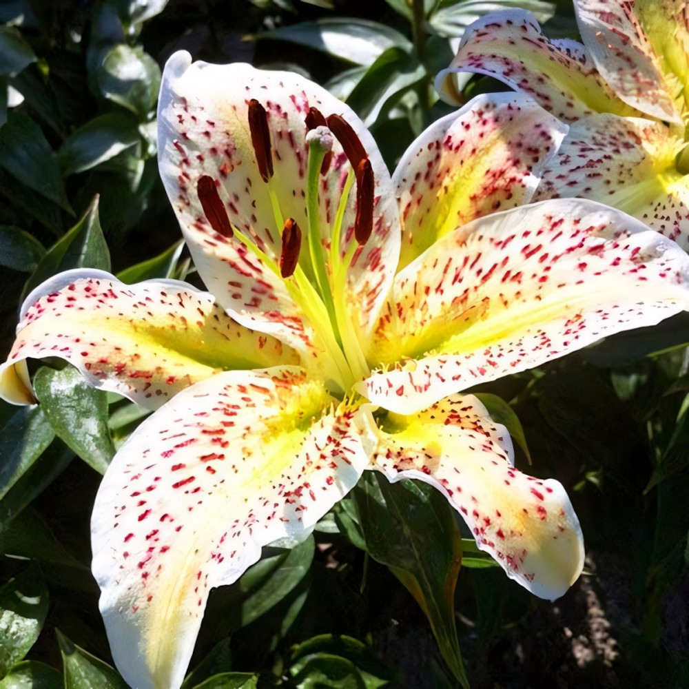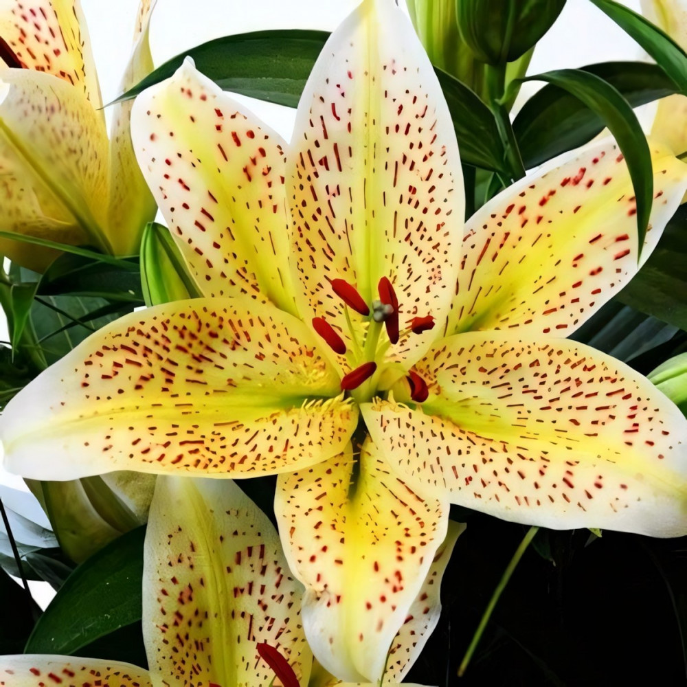 У этой яркой восточной лилии кремовые с желтыми продольными полосами по центру цветы, темно-красный частый крап по всей поверхности лепестков. Отличительной особенностью этой фантастически красавицы являются огромные цветы и благоухающий сладкий аромат. Лепестки слегка волнистые.
