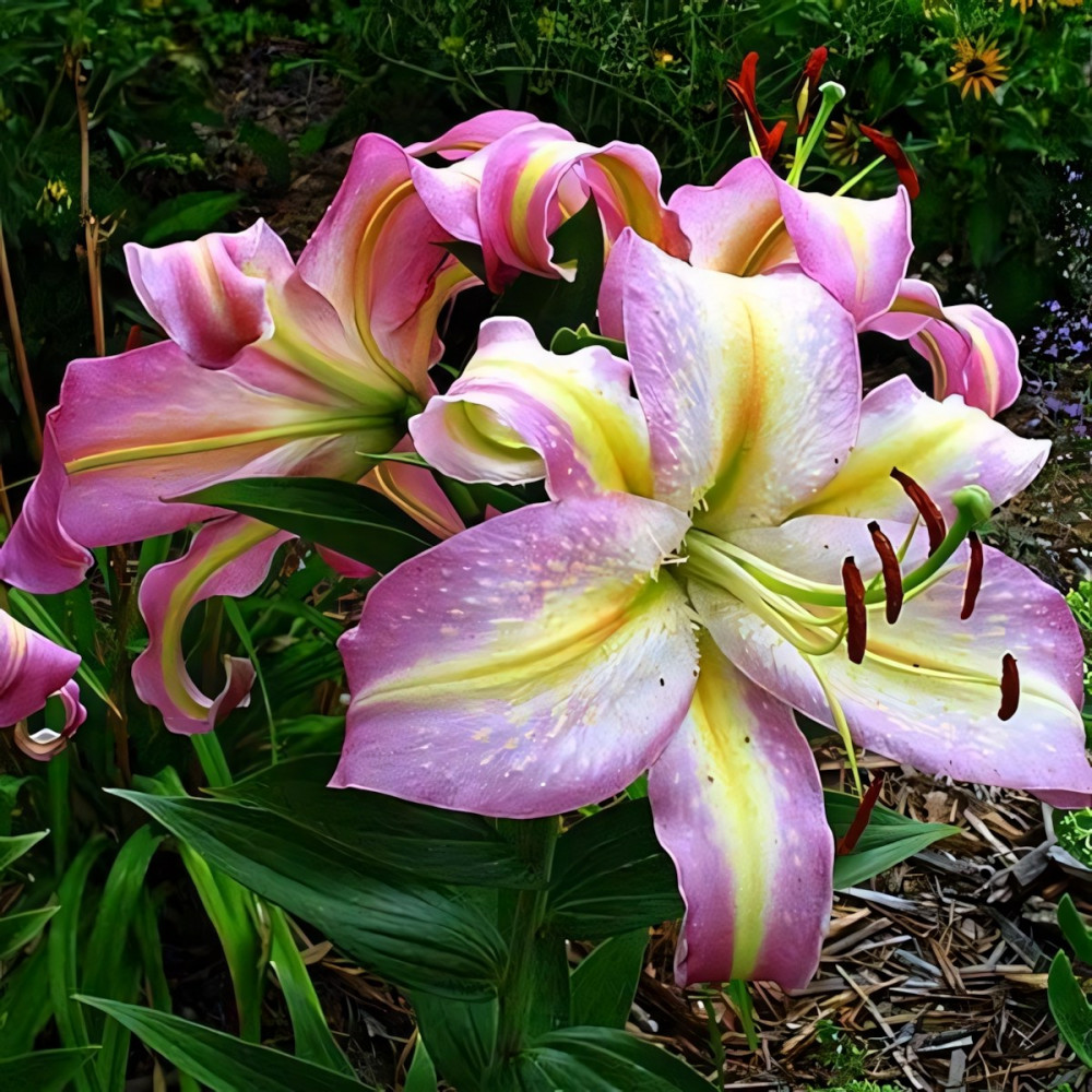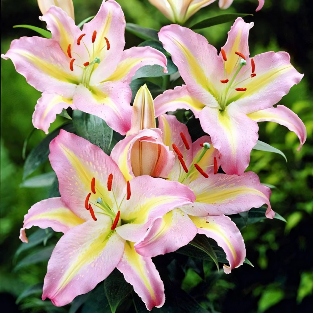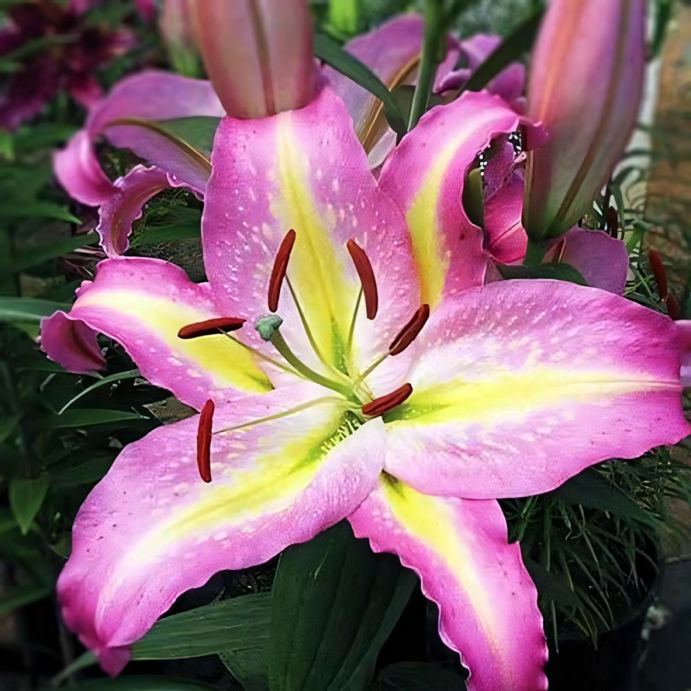 Роскошный, нежный, завораживающе красивый декоративный многолетник. На грациозных цветоносах формируется до 15 бутонов насыщенно-розового тона с нежной желтой полосой посредине и бордовым или золотистым крапом на лепестках. Цветки характерной для лилий формы, крупного размера, хорошо раскрытые, с приятным, усиливающимся по вечерам ароматом. Сорт высокорослый с красивой обильной листвой.