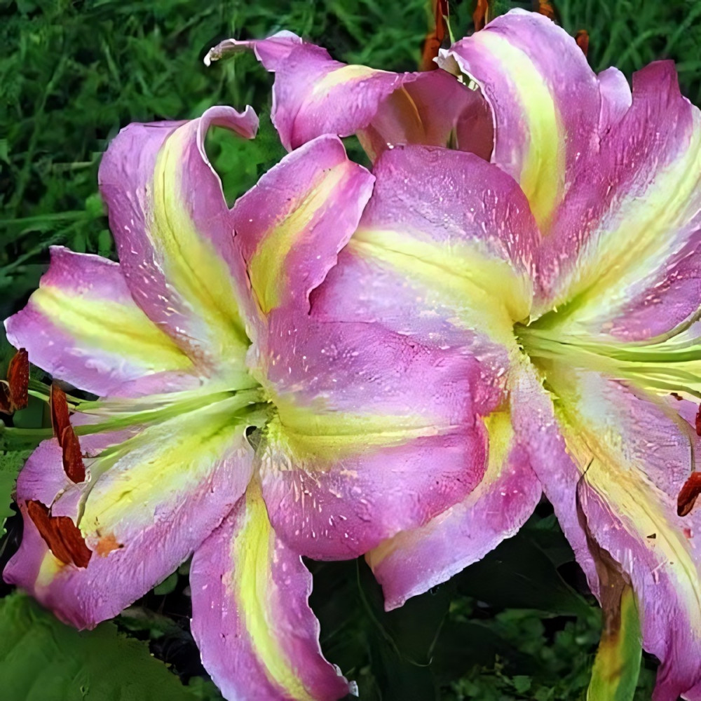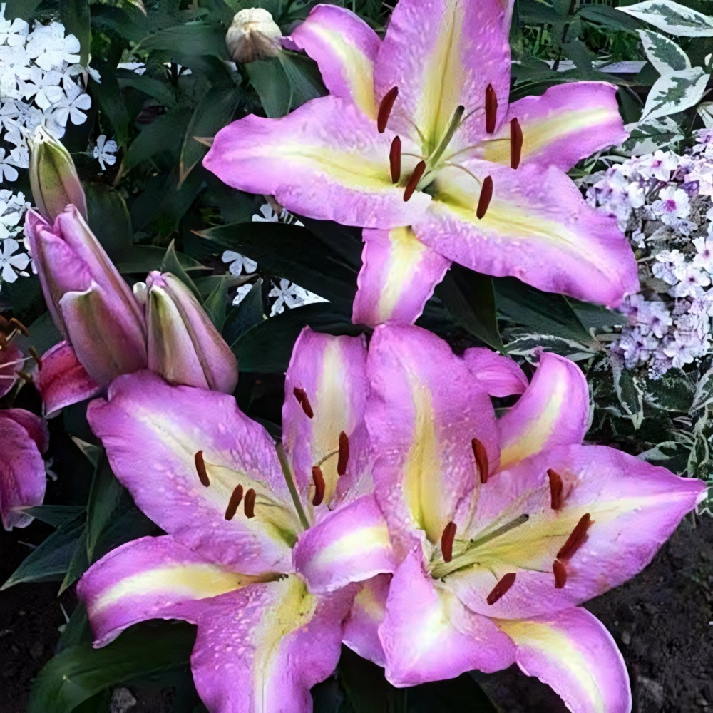 | Период цветенияиюль-август | Стандарт поставкиЛуковица в торфе | Цвет цветкасиреневый с желтыми полосами, тычинки оранжевые |