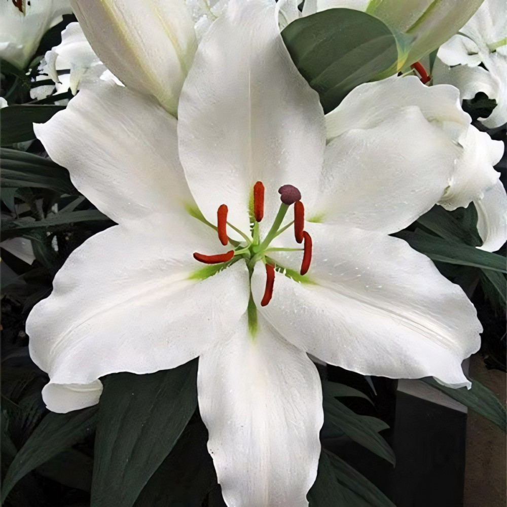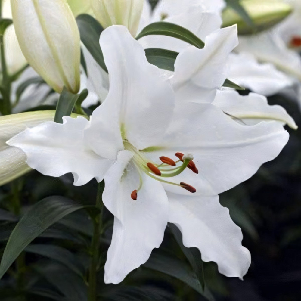 Лилия восточная White Romance (Уайт Романс) - восточный низкорослый гибрид, белый, 4-6 бутонов, цветок диаметром - 21см. Зацветает через 60-70 дней! Высота 40-50 см.
