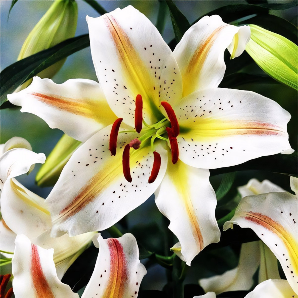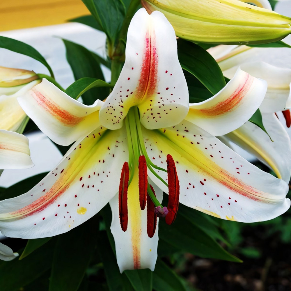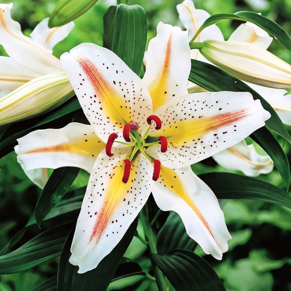 В процессе роста образуются прямостоячие крепкие побеги, покрытые по всей высоте темно-зелеными ланцетными листьями. В верхней части стеблей формируются соцветия, в которых формируется до 7 бутонов. При выращивании в отрытом грунте, цветы распускаются в июле. Их красотой наслаждаются в течение 5 недель. Каждый бутон имеет до 6 лепестков. Они имеют белую окраску с желто-красной полосой посередине. Вся поверхность листьев имеет коричневые вкрапления. В центре бутона возвышаются длинные тычинки с ярко-красными пыльниками.