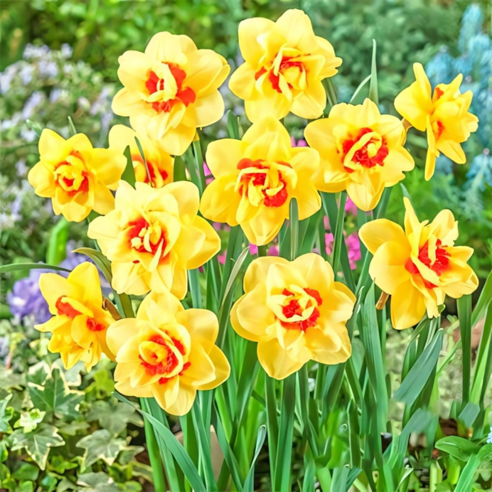 Теплые тона в окраске махрового нарцисса Инноватор делают распустившиеся цветы похожими на рассветное солнце. Лепестки цветка окрашены в желтый цвет, коронка сияет яркими тонами оранжевой и красной палитры. Очаровательный, яркий цветок с незабываемым ароматом.