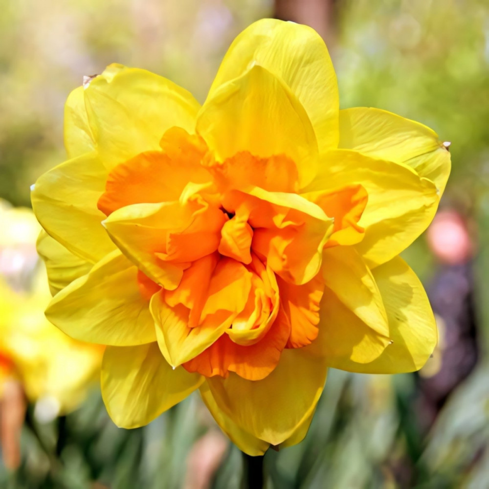 Нарцисс махровый Монца – удивительный луковичный многолетник с махровыми яркими цветами. Коронка цветка окрашена в оранжево-желтые тона, лепестки – яично-желтые. Листья зеленые, узкие, линейные. Размер цветка – до 10 см. Высота растения – до 45 см.