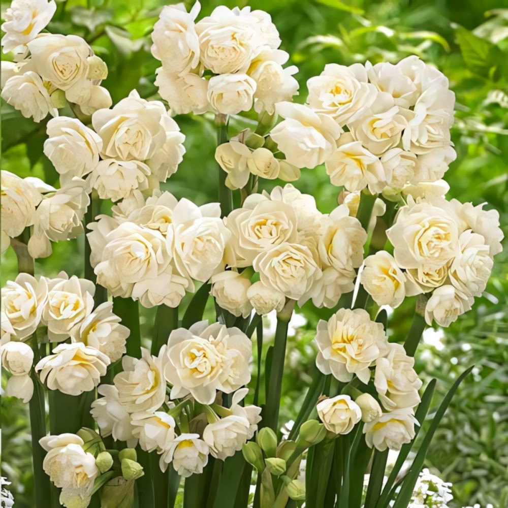 Нарцисс мини Эрличир – многоцветковый сорт с ванильно-молочными душистыми цветками махровой формы. Луковичный многолетник, на одном месте можно выращивать более 3 лет. Высота – 25 см. Диаметр одного цветка – 4 см.