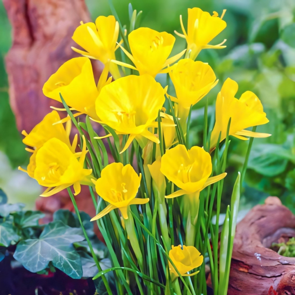 Нарцисс Голден Беллз – это миниатюрный сорт, который не вырастает выше 20 см, поэтому его часто выращивают на альпийских горках и в каменистых садиках. Эта культура имеет уникальный по форме цветок – узкие золотистые лепестки, напоминающие звезду, обрамляют широкую бокаловидную коронку.