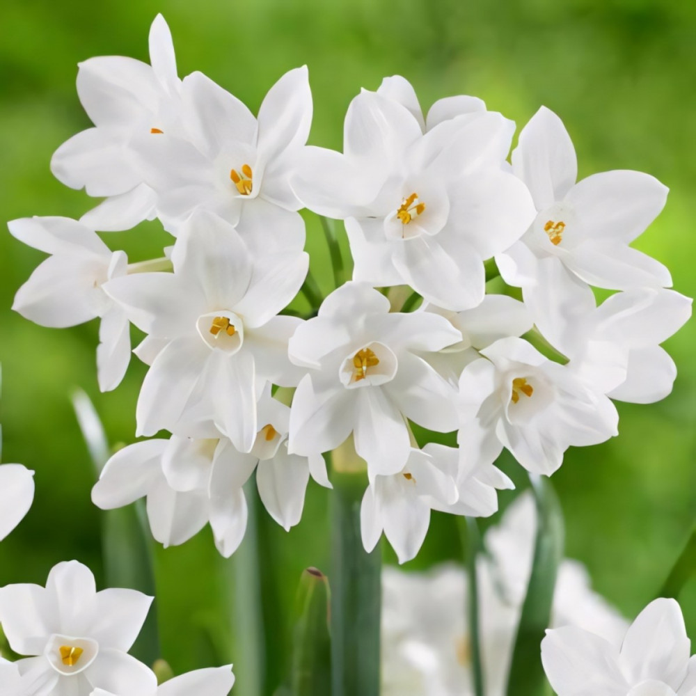 Нарцисс мини Пэпервайт Зива – целое душистое облако белоснежных цветов на одном цветоносе. Сорт относится к многоцветковым нарциссам. Цветение позднее, начинается в мае, может продолжаться в июне. Лепестки – белые, коронка - низкая, узкая, молочного оттенка. Высота – 25 см.